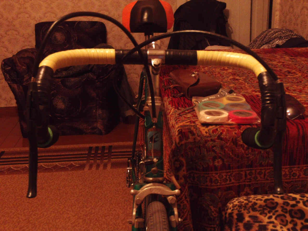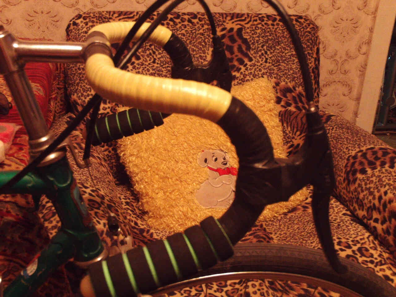 Сегодня решил использовать набор недавно приобретённых цветных изолент, обновил обмотку руля-"барана" зелёного 555-го а вчера установил две новые тормозные рукоятки, получился такой вид -