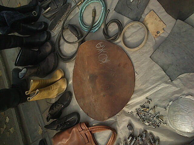 Заклепки медные большие,по бокам носика две латунные,ошкурено,не крашеное-обработаное кремом для обуви безцветным,и кремом для рук,шнурованое,с тиснением (не совсем удачное-неглубокое - потому прошелся по нему выжыгателем потом)-его немного видно с левого края у носика.