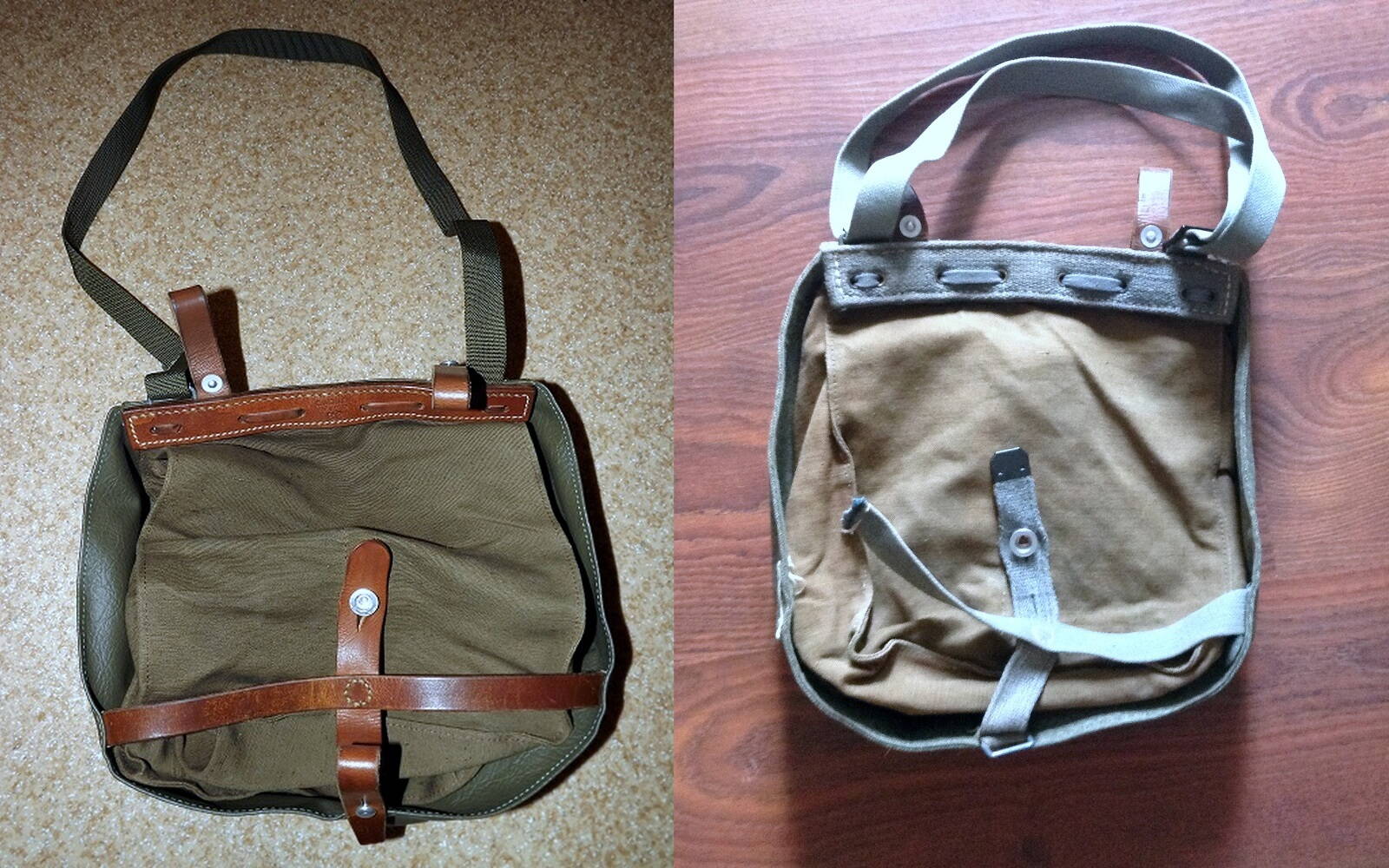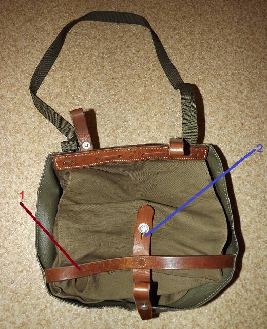 Видов этой сумки очень много, поскольку была она на вооружении с 1924 по 1980 гг.. Состоит она из двух элементов: 1 - защитный верхний клапан; 2 - сама сумка, с двумя отделениями и ячейкой под флягу. Сейчас продаются два вида, мало чем отличающиеся друг от друга. Основное их отличие в том, что верхний клапан может быть сделан из двойного брезента , раскраской соль-перец или прорезиненного кожзама. цвет олива.