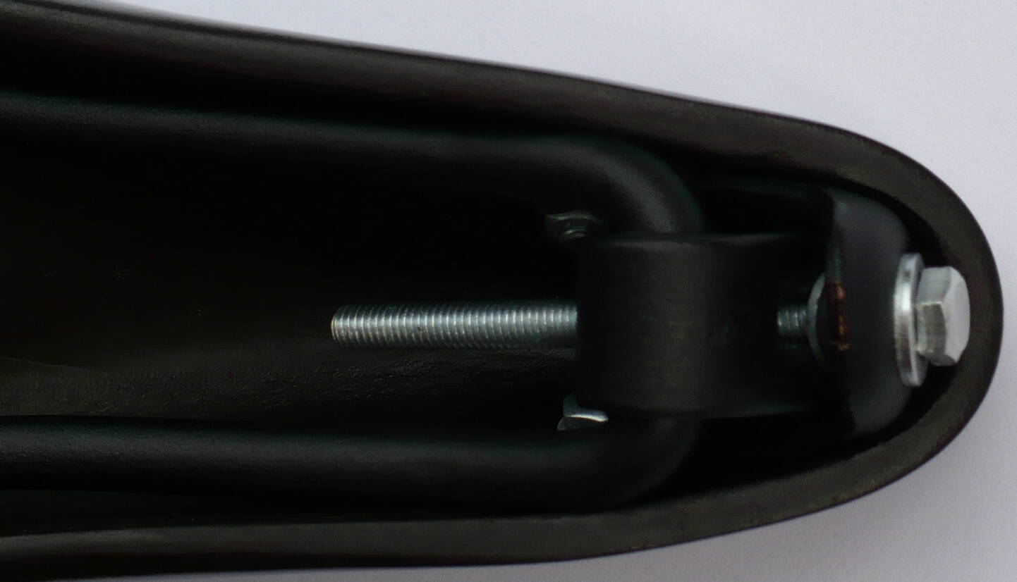Болт натяжения заменил обычным М5. Для регулировки хотел использовать две гайки - одна фиксирует сам болт в носике, вторая "отталкивает" носик через упор от каркаса. Но пока в это место входит только одна шайба. Надеюсь седло "разносится", тогда и гайки поместятся.
