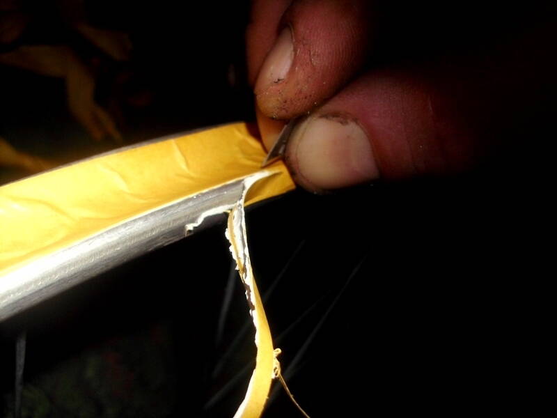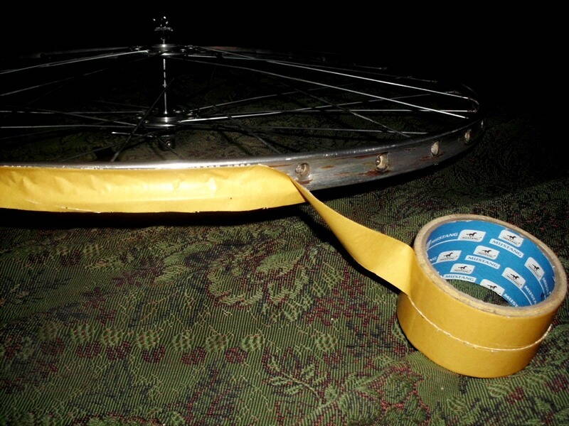 Приклеил скотч на колесо, ведя ровный его край по кромке обода. Начал от отверстия для ниппеля.
