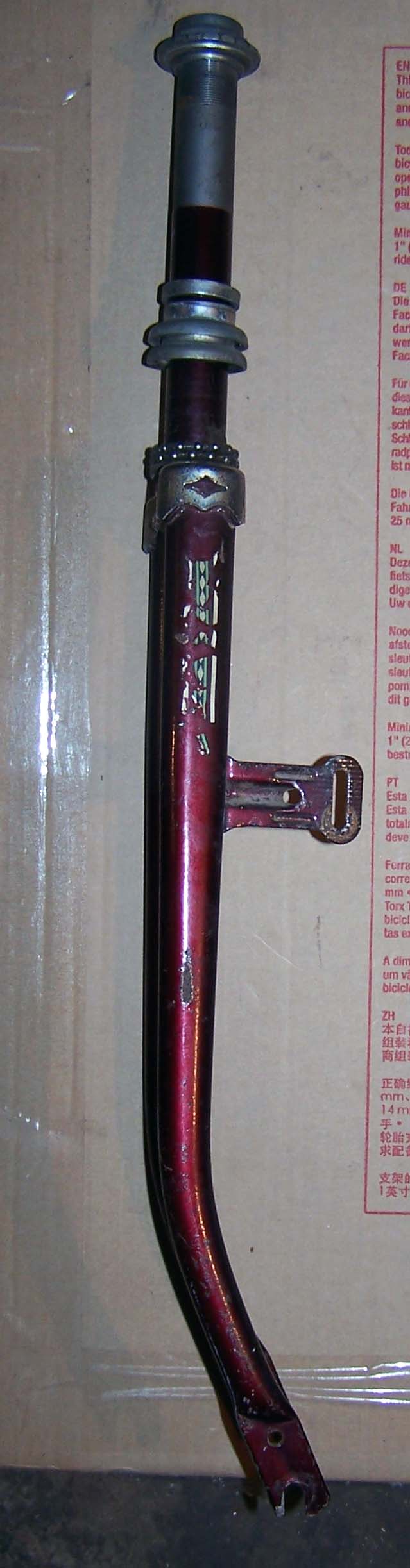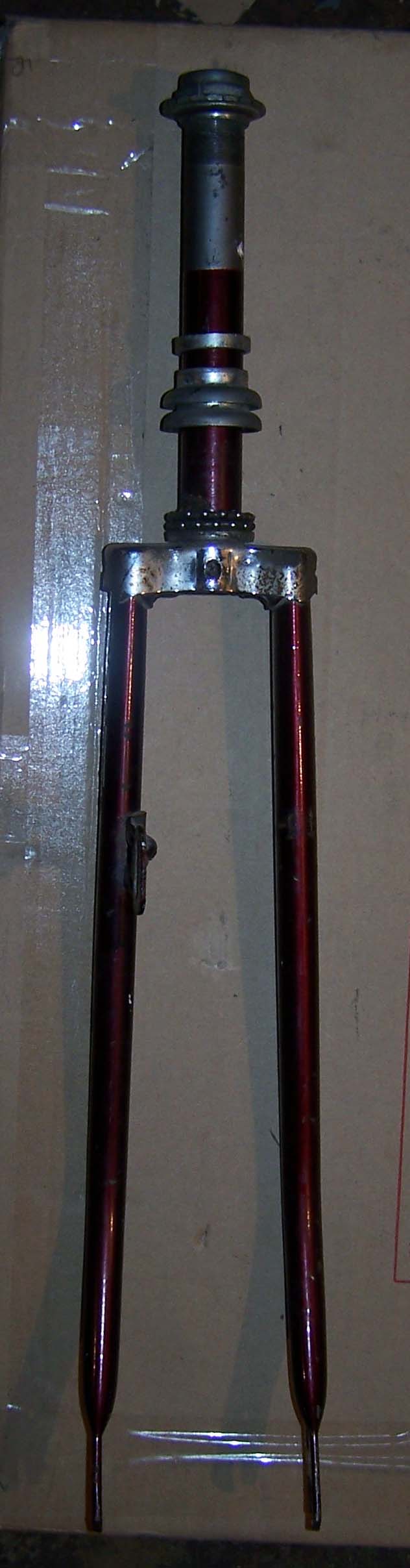 Каретка крутится неплохо, довольно гладко. Чашек рулевой колонки и подшипников к ним нет, обратите внимание (но подойдет любая советская колонка, хоть от "Украины"). Нижний межперьевой мостик почему-то приварен слегка наискось. Похоже, он не был оторван и не присобачен обратно, а таким получился еще на заводе.