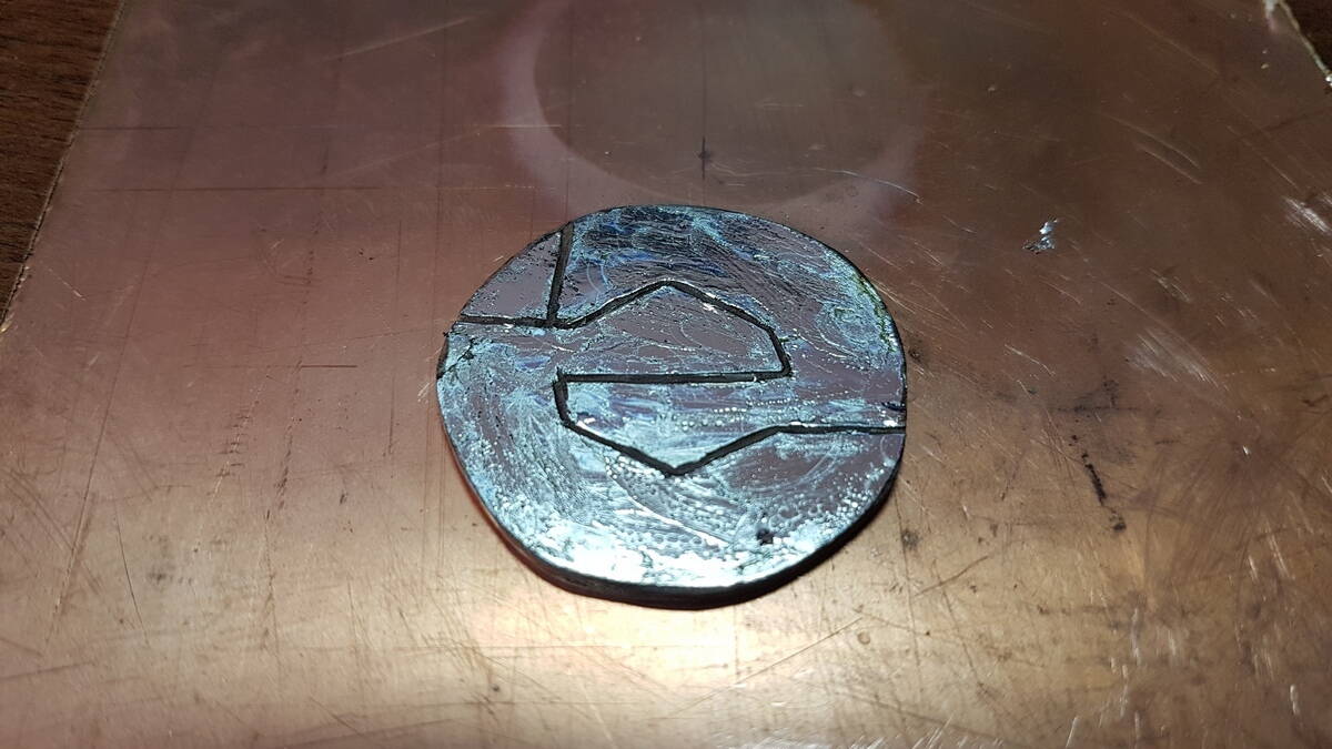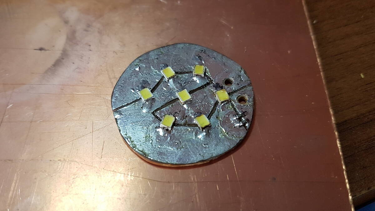 Заниматься травлением мне не очень хотелось и я по-быстрому вырезал из 2х стороннего гетинакса кружочек Ø34 мм, чтобы он буквально чуть чуть проваливался в корпус отражателя. Далее взял канцелярский нож и просто разделил платку на 3 полигона больших, просверлил отверстия для проводов, залудил и получилось вот такое: