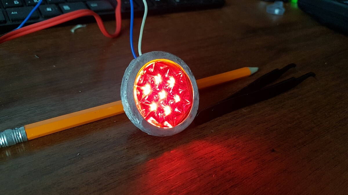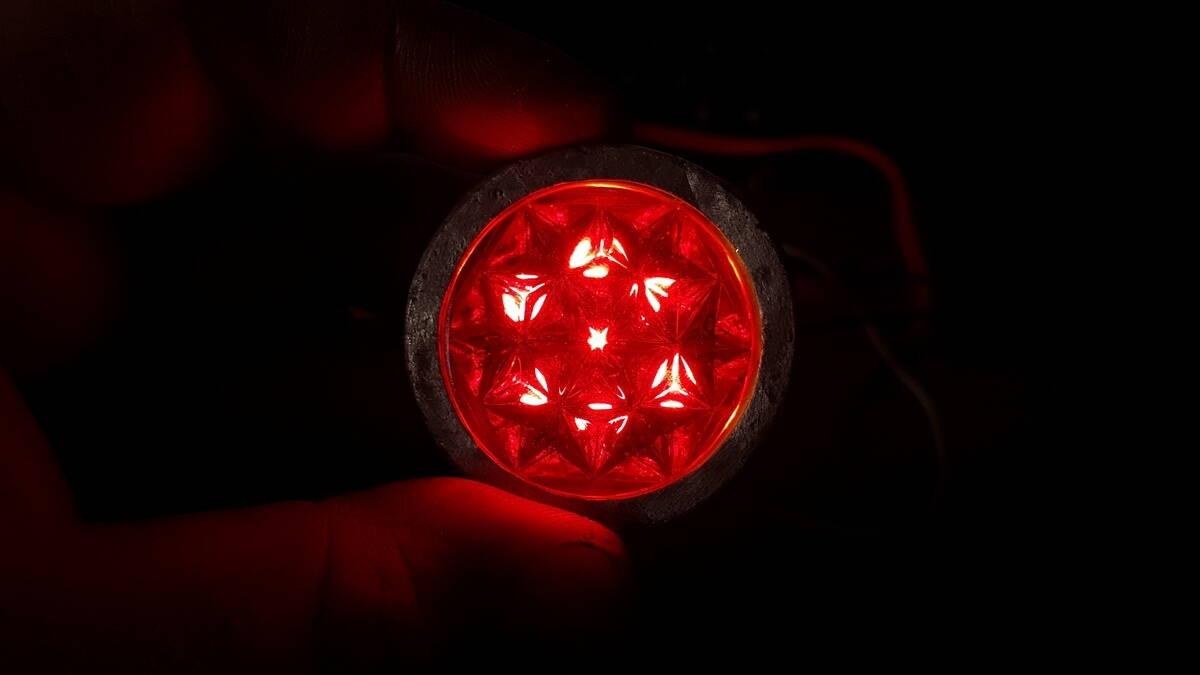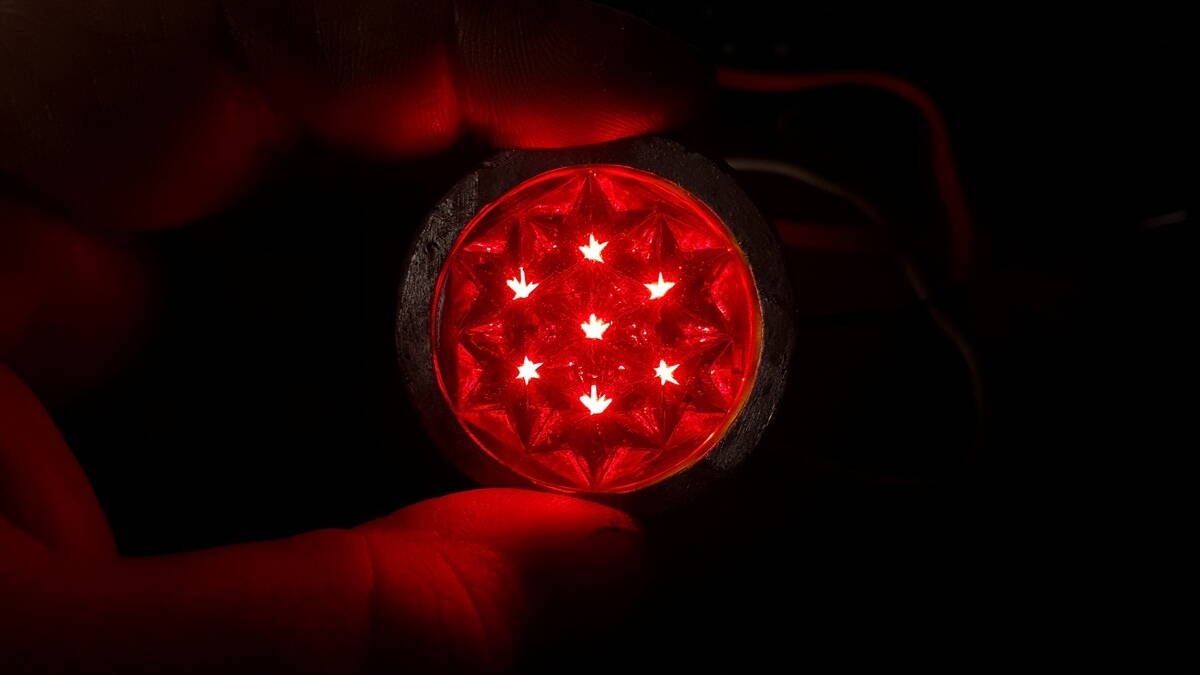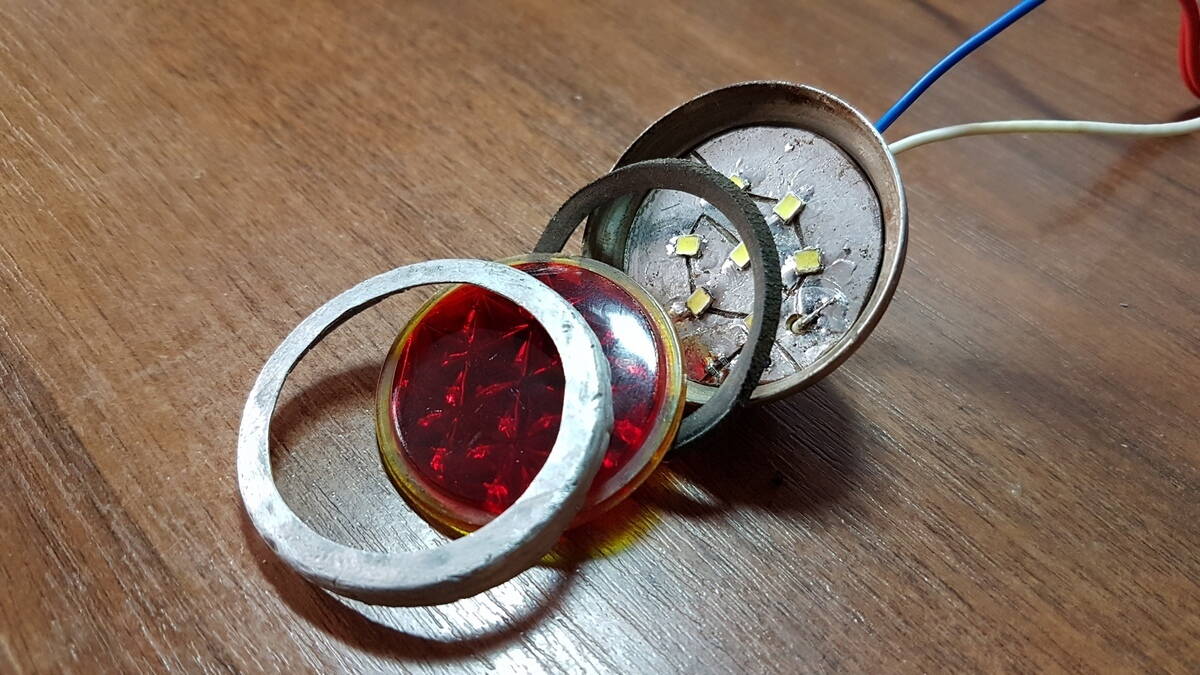 Но и любое стекло фонаря с рассеивателем сильно сбивает яркость. Именно поэтому, поэксперементировав с разными красными стекляшками, я оставил на зисе голые светодиоды.