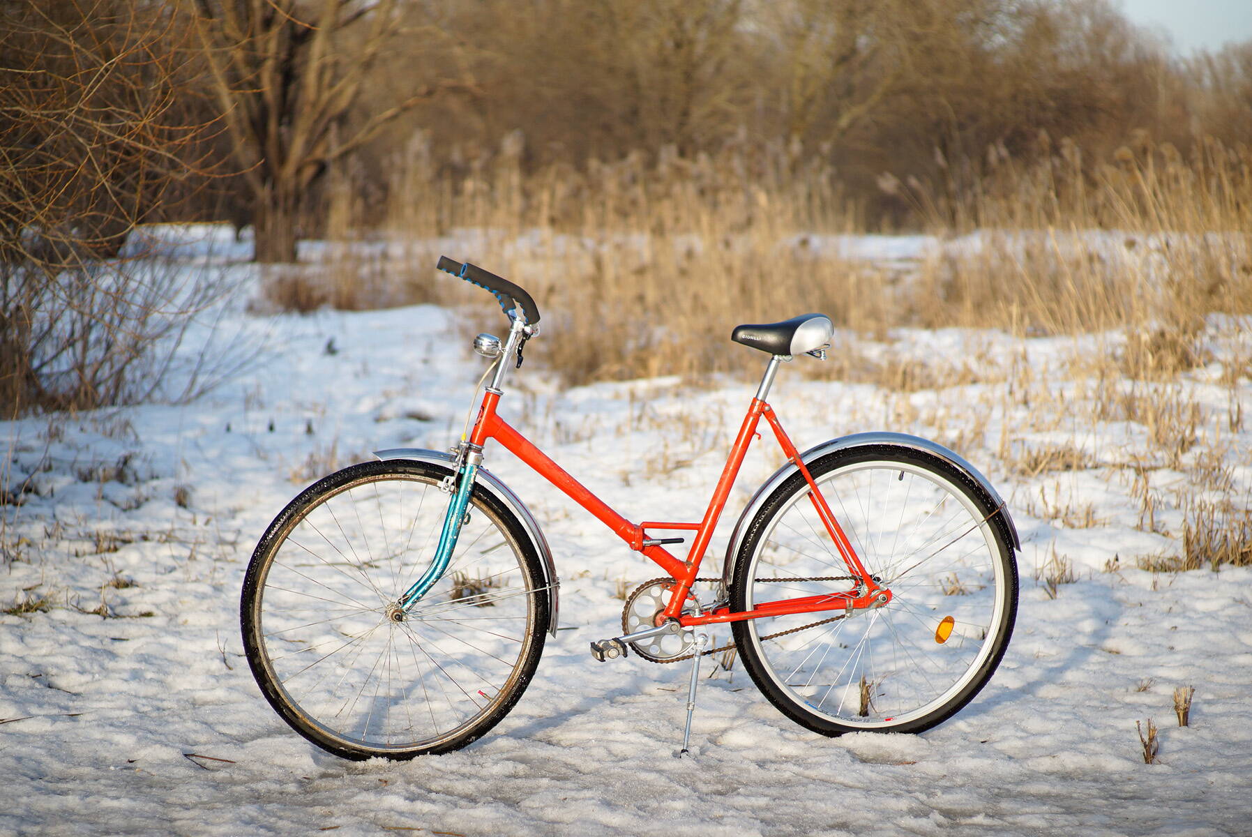 Вот такой, только ярко оранжевого колера с белыми крыльями и защитой цепи.