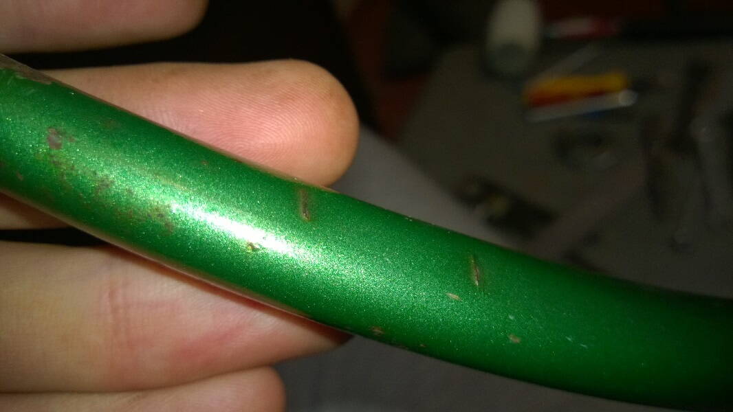 Видно конечно у распорки искривление, но между дропами расстояние нормальное, колесо стоит нормально, может он изначально с завода такой пришел, к тому же распорка немного криво приварена. Уже как колесо куплю, посмотрю. А пока пес с ним! Из положительного за сегодня : снял цепь и выкрутил переклюк:)