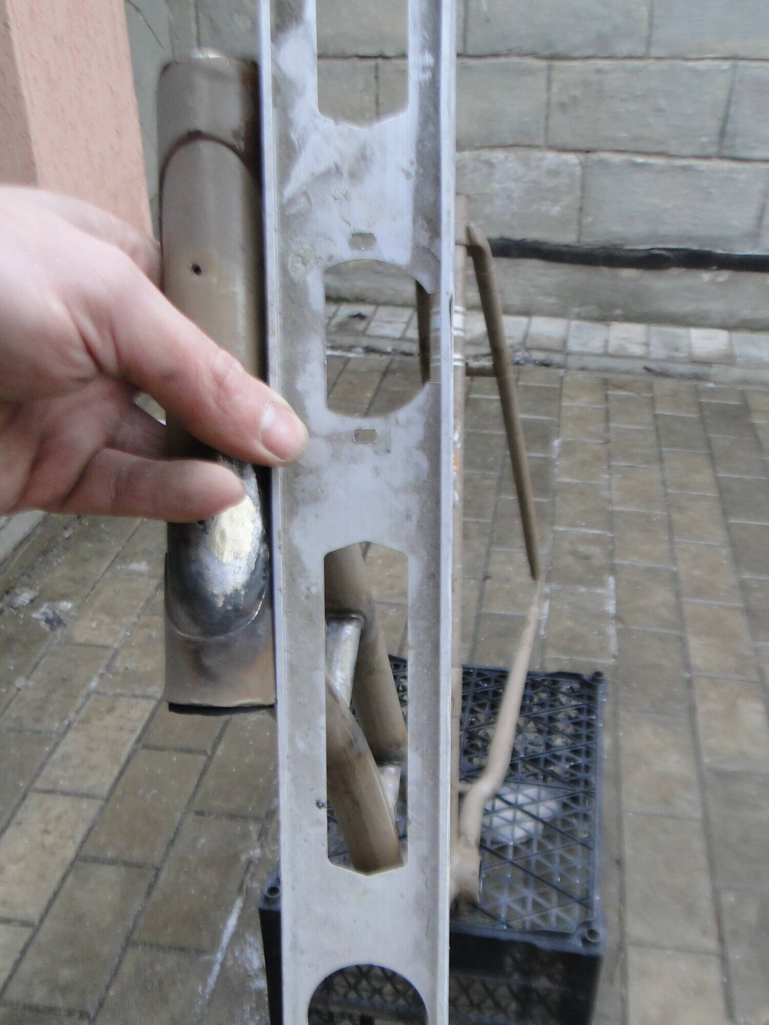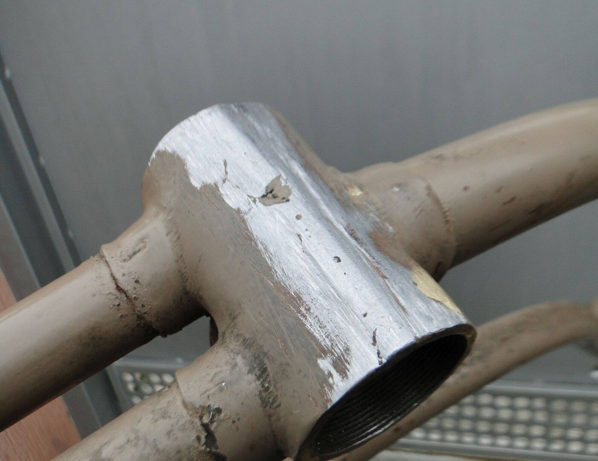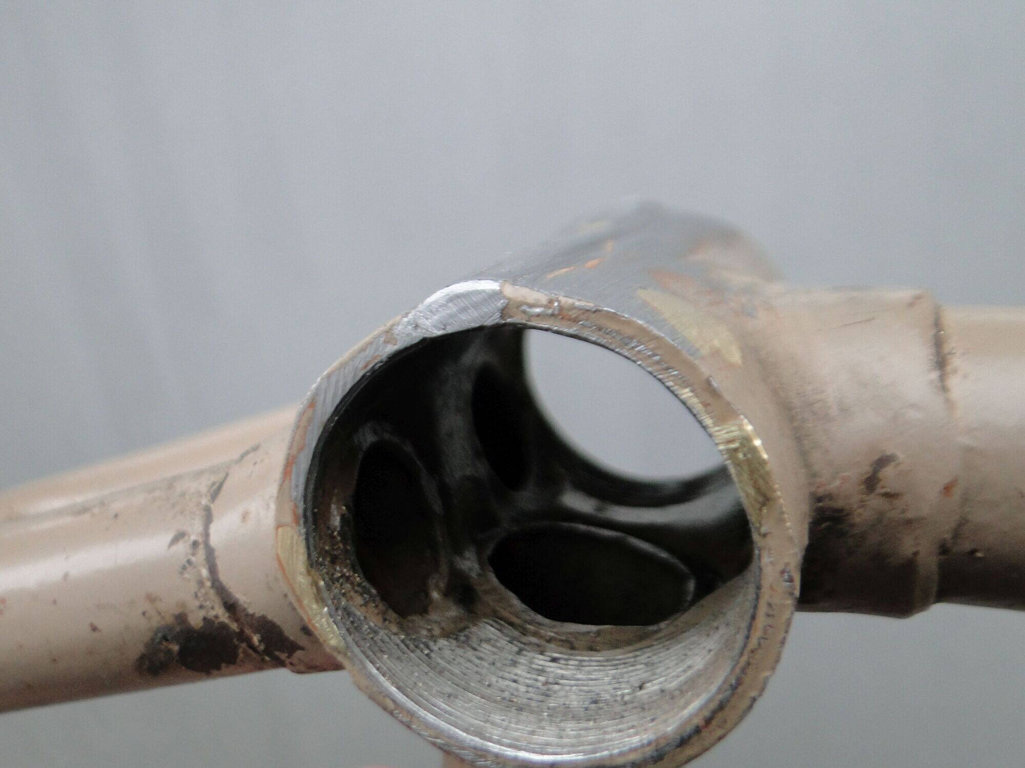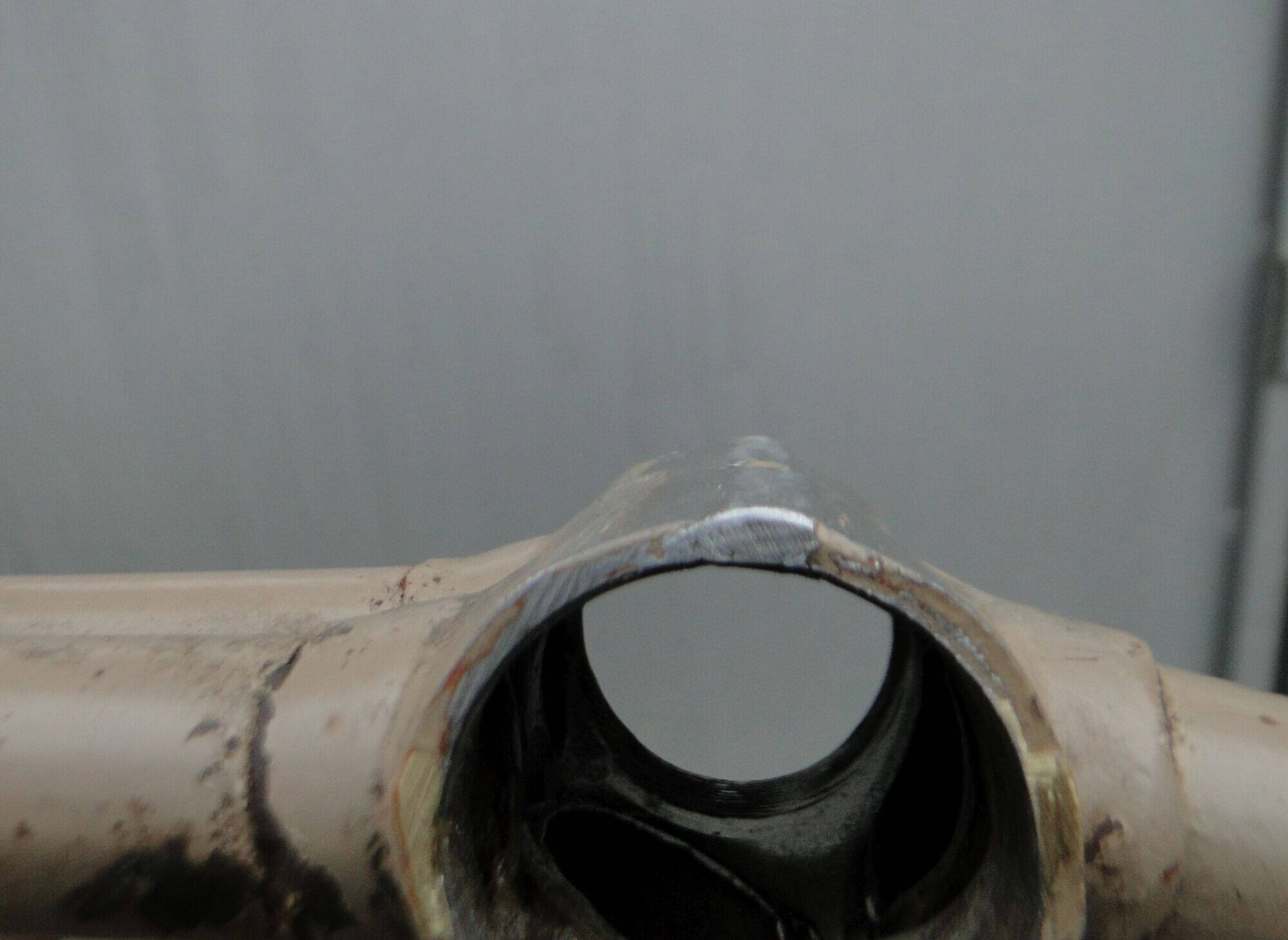 Ну а передняя вилка не порадовала вообще. Видим, насколько правый (по фото) дроп был меньше утоплен в теле вилки при пайке на заводе. Думаю, что нужно расплавить старый припой, забить дроп глубже, запаять его латунью заново.