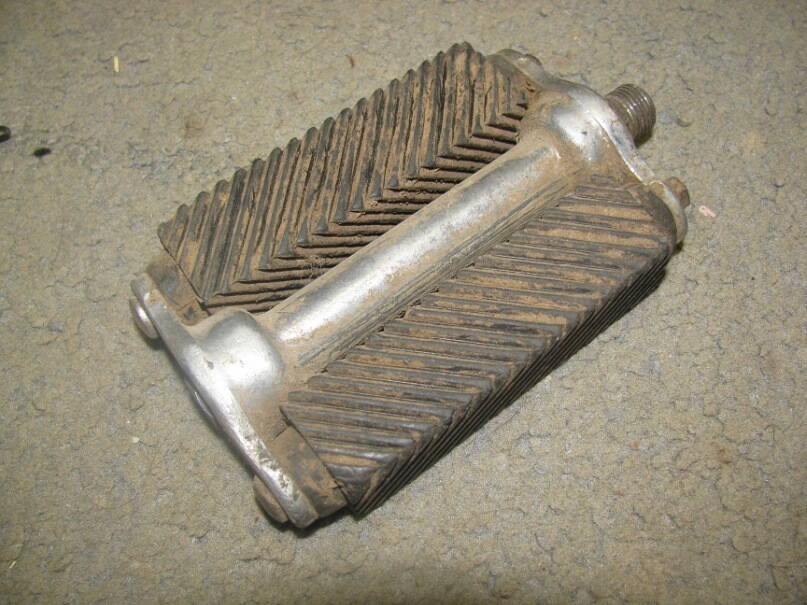 ага, вот уже интересно - такая педаль. с нарезкой 45 градусов у меня только одна на той, что 1967 года, две моих и одна на 1967го - с поперечными сечениями. резина черная, металл - сталь, это я уверен на 100%.
