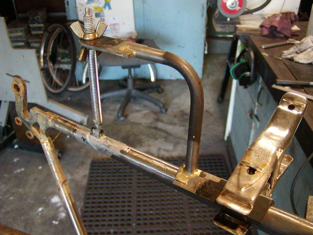 Припаял припоем ПОС. Надо сказать, что паяльнику не хватает силенок, чтобы прогреть трубу, поэтому на помощь пришел промышленный фен на 1.5 квт. Прогрел им раму, залудил с помощью паяльной кислоты, бонки легко прогрелись паяльником, залудились без проблем с помощью паяльной кислоты. Припаивать пришлось тоже привлекая фен - одной рукой греем феном, другой паяем. Спаивал луженые детальки при помощи флюса ЛТИ-120.