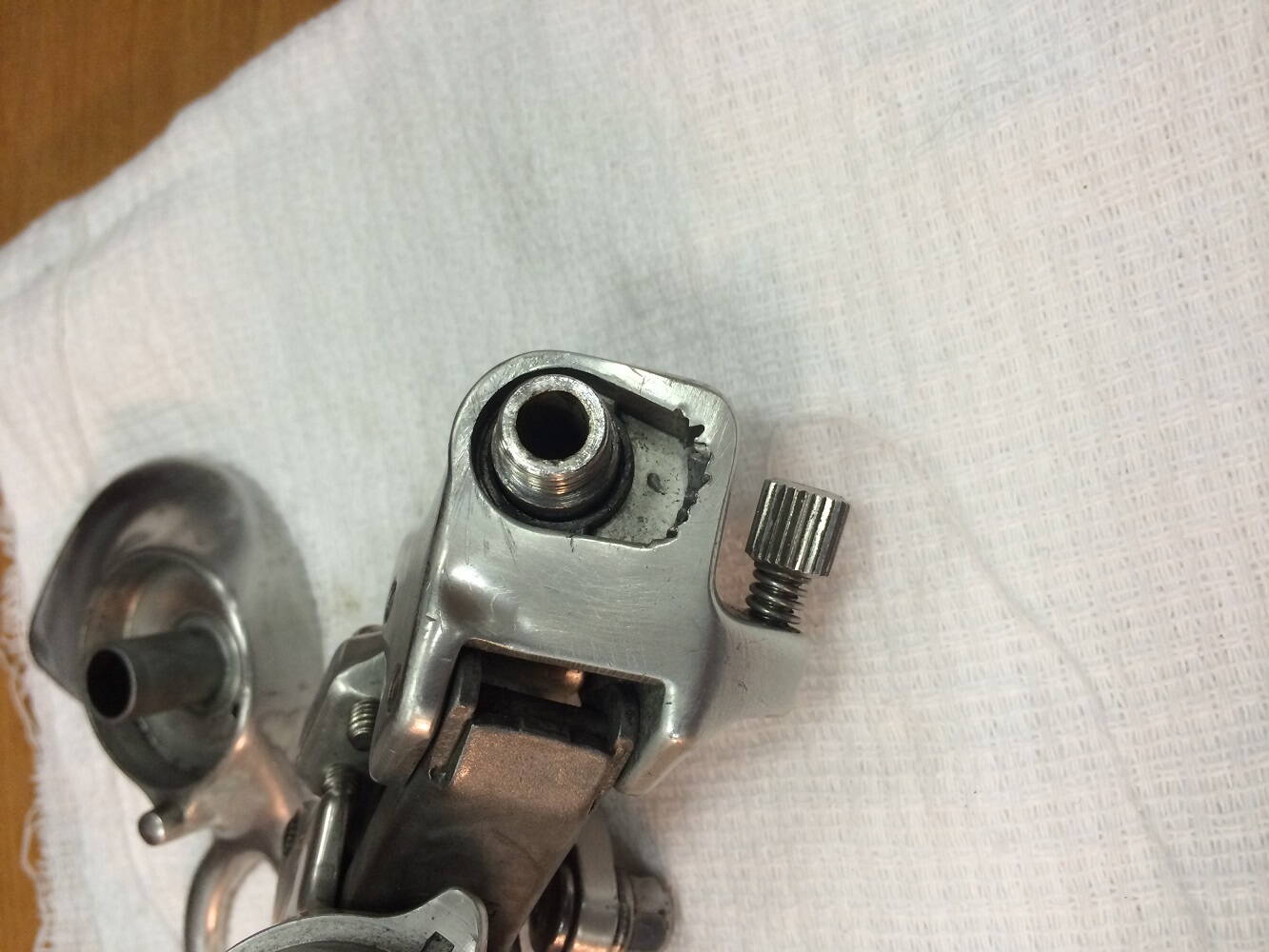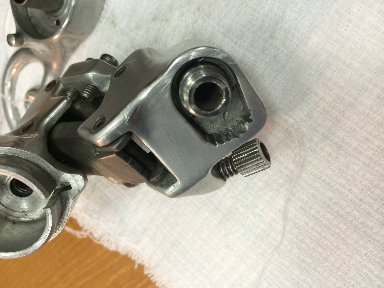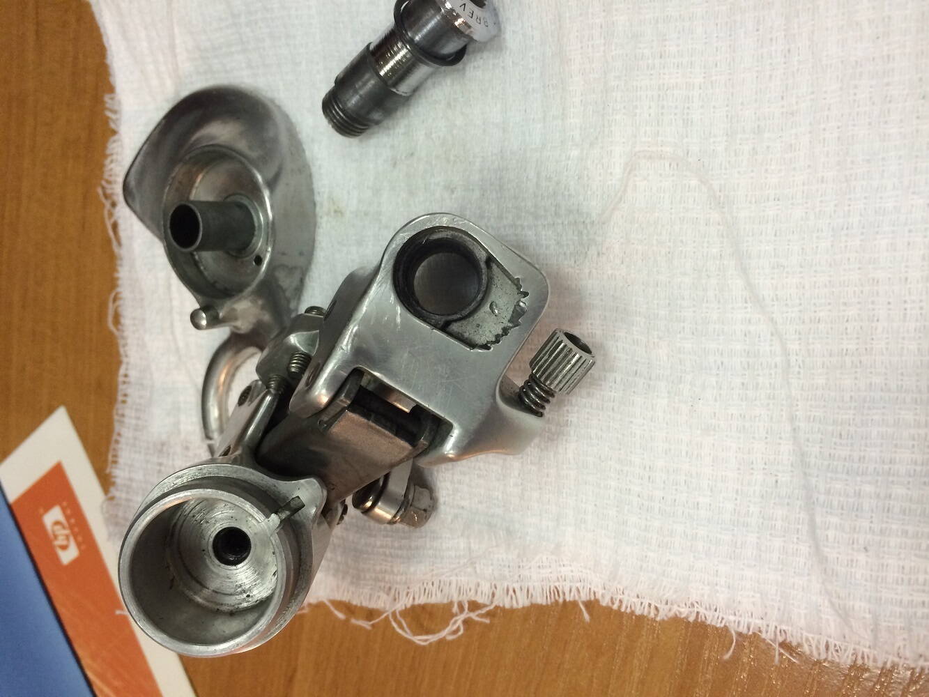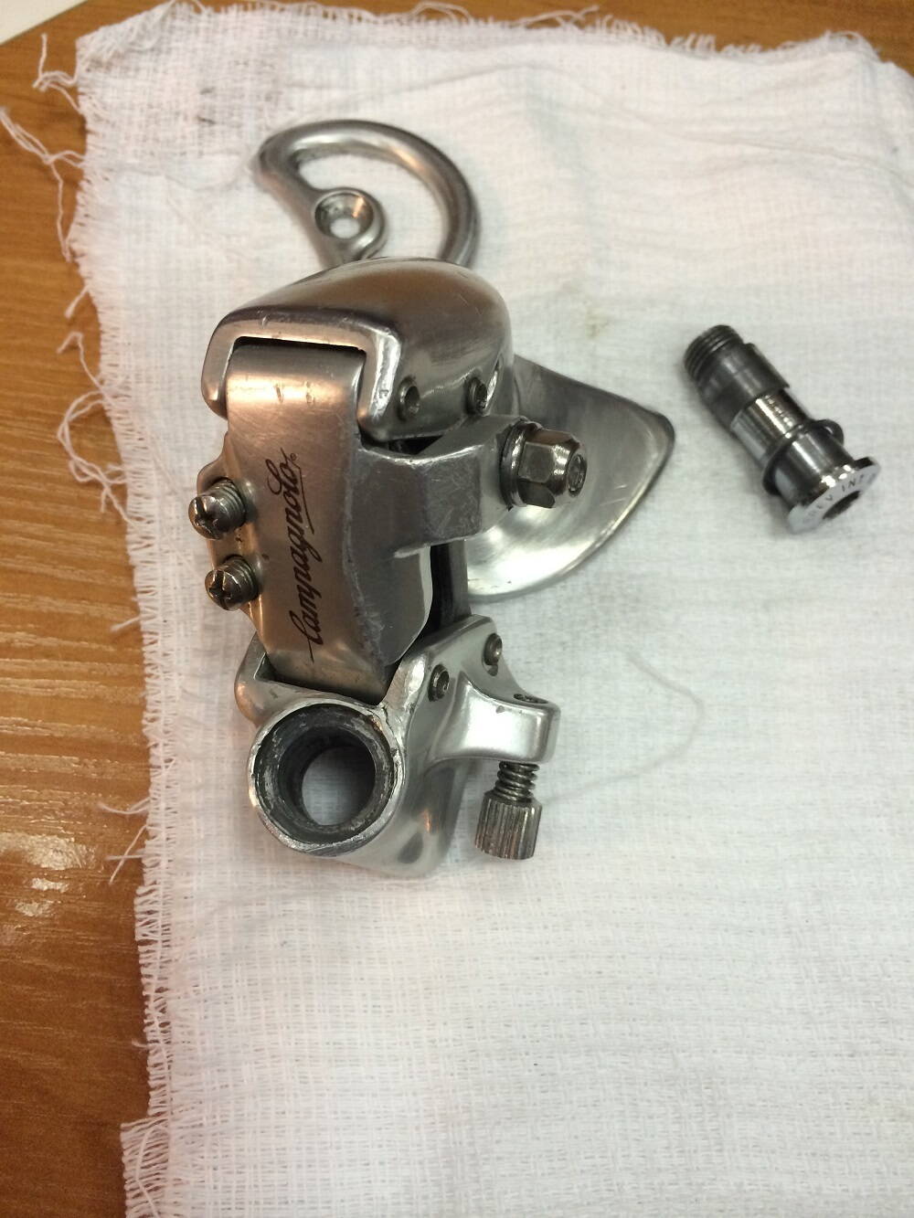 Попал мне в руки задний переключатель Campagnolo (на фотографии в разобранном виде) покоцанный сильно, ролики уже убиты, начал я его отмывать полировать и восстанавливать, а потом задумался, а упора то в петуха нет, похоже что не хватает детальки упора в раму, может быть у кого то есть знания какая деталька должна там стоять?