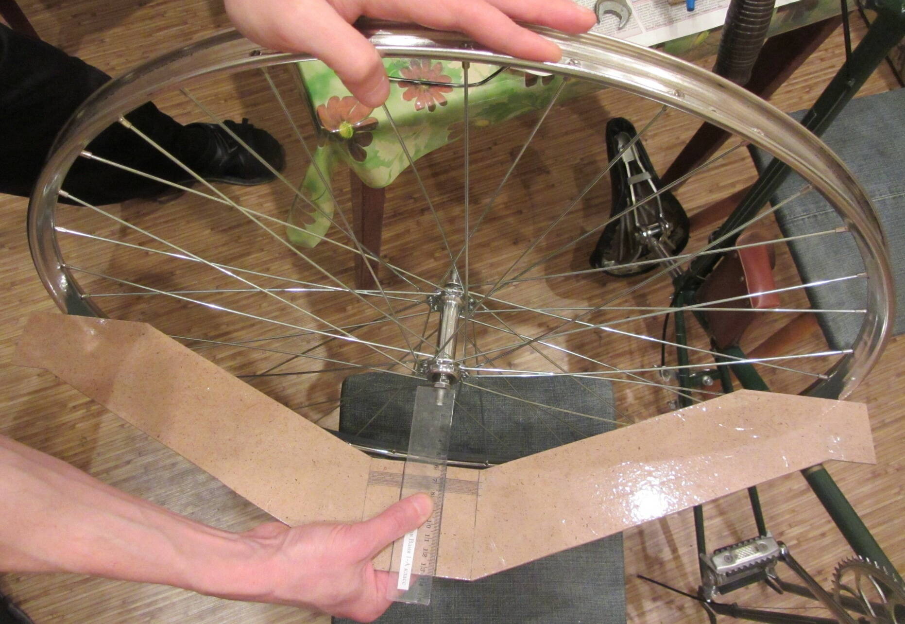 Настраивал в вилке. За 4 часа вывел все биения в 1 мм. Понятно, что примерно. Профессионального инструмента, чтобы проверить, не предвидится. Вот только проверить натяжение спиц совсем нечем. Тензометра нет.