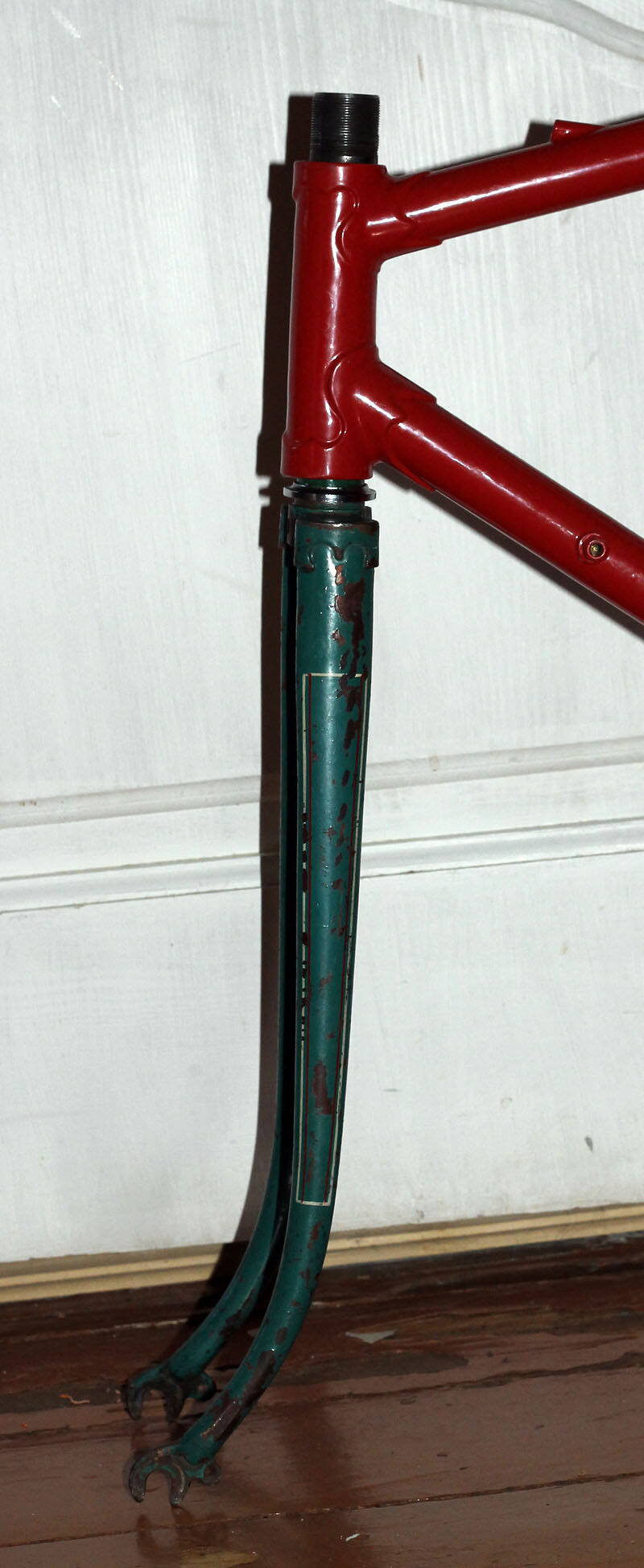Итак, вилка страшненькая зелененькая. Видно, что наездила она не мало км. Изгиб большой, если не ошибаюсь, это до 80-х такие делали. Раз изгиб большой, то будет она довольна мягкая на ходу. Не хуже карбона :)