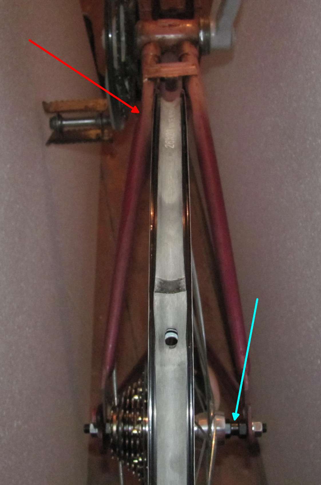 в месте обозначенном красной стрелкой есть опасность "залома"? Колесо выставлено максимально правильно (из тогочто на сегодня смог без напилинга). Перед установкой колеса рама проверялась резинками.