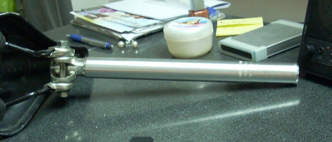 Я конечно ожидал подседел с рамкой крепления, ан нет, просто штырь. Так что крепеж остается старый. По длине впритык, даже немного коротковат, всего 30 см. Но зато алюминий и при педалировании ноги теперь выпрямляются )) ну почти )) - фото завтра ))