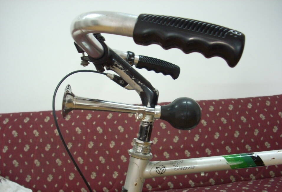А вот руль...век живи - век учись. На предыдущих фото видно, что руль стоял городского типа, загнутый назад. Так вот с прямым (почти) рейзером и родным старого образца выносом настолько сия конструкция изгибается, что кажется вот-вот сломается как спичка. Поставил старый руль обратно - снова стало более или менее нормально, нагрузка-то на него (руль) другая, так как сидишь больше на пятой точке. Да и при простом боковом нажатии на края руля изгиб не такой "страшный". А обычный рейзер хотелось, так как и тормозных ручек на родной нет (он больше диаметром) и на обычном руле тормозное усилие больше из-за того, что давишь сильными пальцами ))). А теперь придется смотреть что делать дальше.