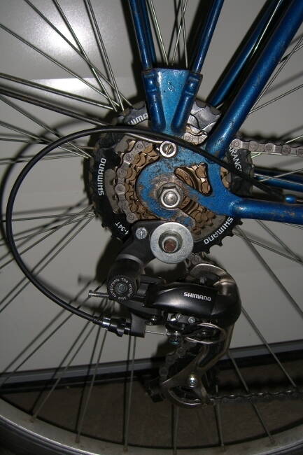 Попутно заменил все рубашки тросиков и тросик заднего тормоза. Для переднего переключателя пришлось выдумывать упор для рубашки троса, чтобы красиво завести его снизу в посадочное место. Если нужно кому - могу подробно сфотографировать (в двух словах выгнутый кронштейн из оцинковки в виде буквы S с тремя отверстиями и крепящийся к родному нижнему болту от заднего крыла. И пришлось укоротить слегка заднее крыло, так как мешало установке и движению переднего переключателя. Об этом я правда пожалел после первых пробных заездов по мокрой грунтовке - закидывает грязью с заднего колеса как раз тросик и сам переключатель. Теперь буду выдумывать что-то вроде резинового брызговика. В довершение ко всему пришлось ровнять плоскость петуха, чтобы добиться параллельности с колесом (наследие абыкакого раздвигания задних перьев).