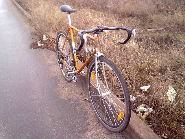 Вот мой крокодил. Пока что не покрашен, нет заднего тормоза и обмотки руля, и седло старое стоит. Я не хотел ставить моноблоки шоссе и шатуны на 51 зуб, потому что денег у меня таких нет. Я просто поставил обычные тормозные ручки, и нарамные манетки. Кстати они хорошо работают! На данном этапе стоимость приблизительно 2200 грн.
