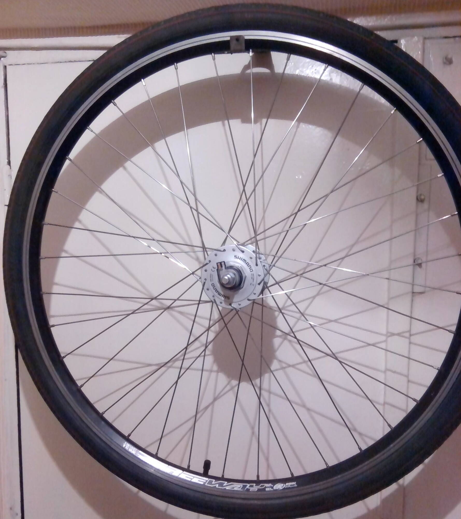 Спросонья сил у неё хватило только побороться за переднее колесо, но я всё равно победил и старое колесо отобрал.
