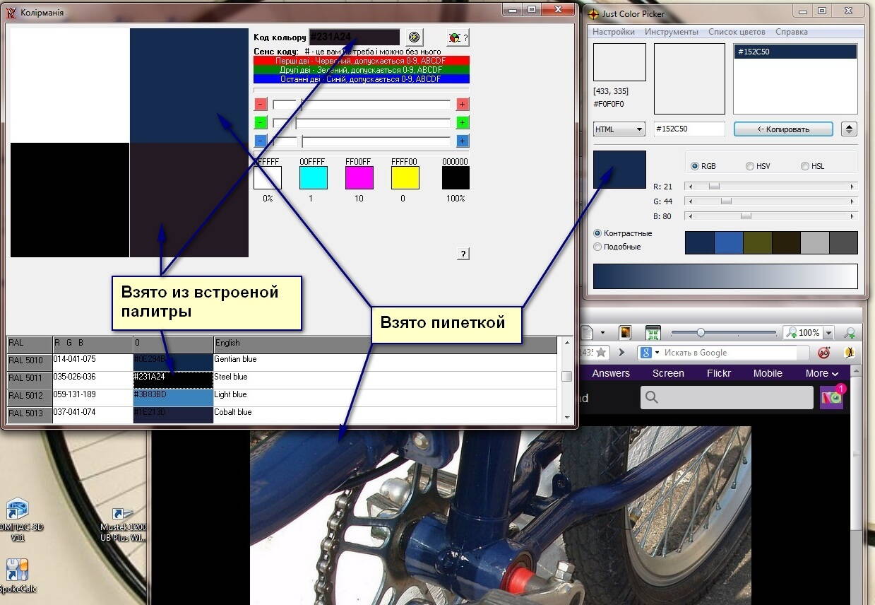 Замечание получается какое. Вот живой велосипед (для сравнения), вот монитор с причандалами - Колирмания, Пипетка и фотка того велосипеда.