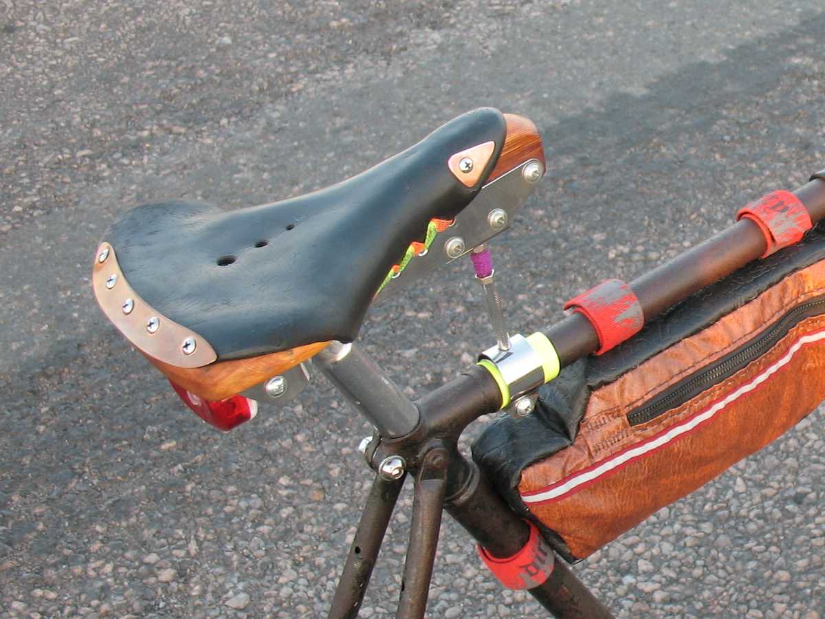Верхняя часть винта входит в деревянный нос седла, там достаточно широкое и глубокое отверстие чтоб можно было поднять-опустить седло на пару сантиметров. И фиксируется это двумя гайками, под пластиной из нержавейки и над ней, внутри между деревяшкой и пластиной. Таким образом седло не может сдвинуться ни вверх ни вниз. Держит крепко, однажды я выехал вообще с незатянутым болтом замка седла, и обнаружил это только потому что оно подозрительно постукивало и немного люфтило.
