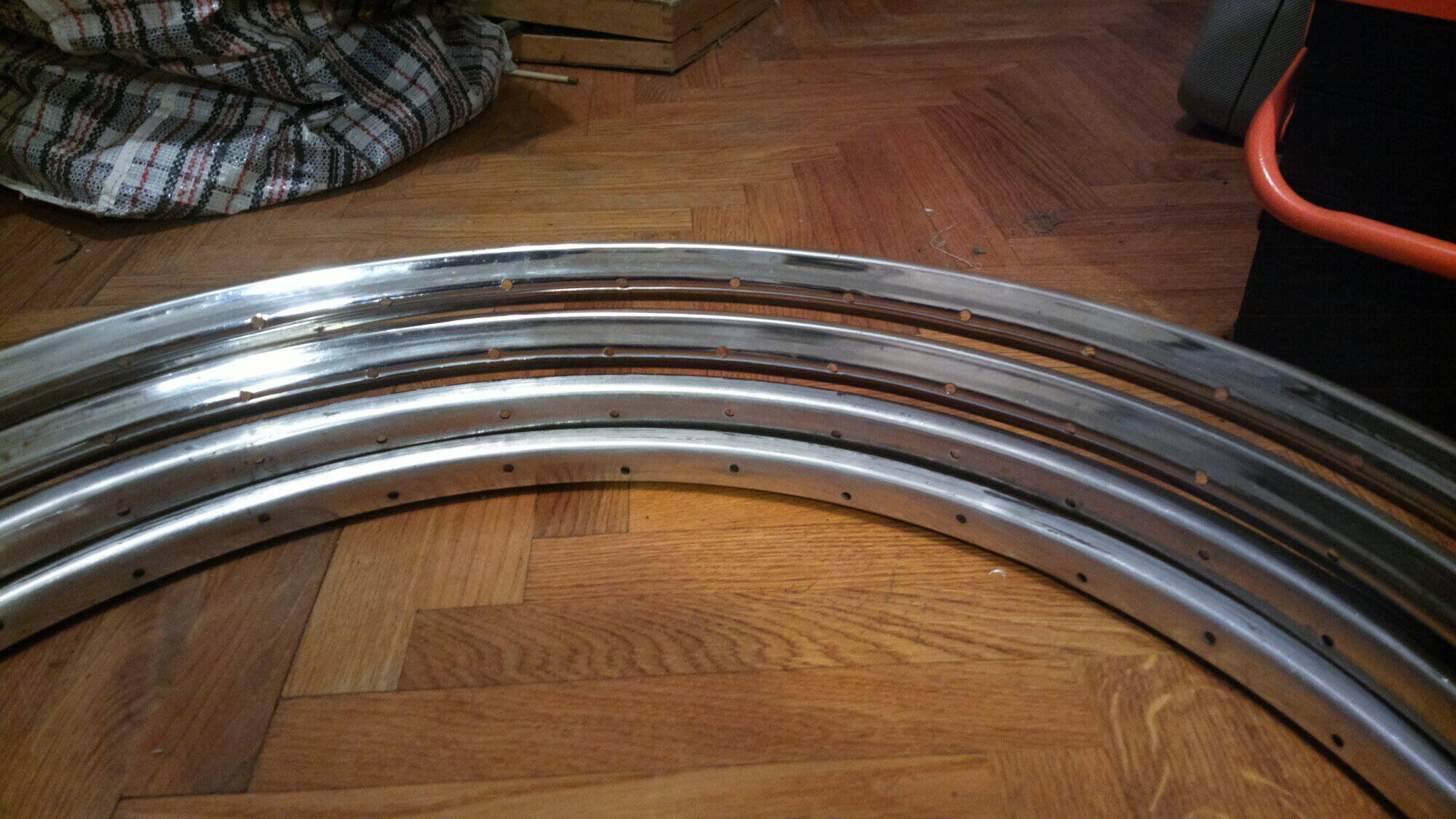 Итак, в понедельник привезут полироли и пафосную смазку - мои запасы древнего и очень качественного Литола подошли к концу и я решил попробовать импортные аналоги на литиевой и на силиконовой основе, после чего я начну собирать колеса. Сегодня была куплена 70% уксусная кислота и поставлен производственный эксперимент на ручках тормозов, выносах и рулях - результат положительный, выкладывать не буду, потому что надо будет что-то зачистить более тщательно, а что-то полирнуть, тогда и покажу. А вот ободами я похвастаюсь, поскольку результатом очень доволен - они ровные ("чайку" только в одном месте обстучать надо будет) и сверкают что надо (но полировать тоже буду). Как я это делал: 1) надел повязку на лицо, дышать невозможно даже через нос; 2) полностью открыл окно, помещение должно быть проветриваемым; 3) если есть резиновые или тканевые перчатки, тоже используем; 4) стелим клеенку или пленку на пол, включаем лампу - в важном деле света мало не бывает; 5) берем тряпочку, складываем ее на манер носового платка и аккуратно промакиваем из бутылочки (бутылочку плотно закрываем, чп при опрокидывании нам не нужно); 6) плюхаемся у окна над клеенкой и начинаем тереть тряпкой поверхности, как только тряпка изгаживается (это будет происходить довольно быстро), перескладываем или переворачиваем на чистое и продолжаем.