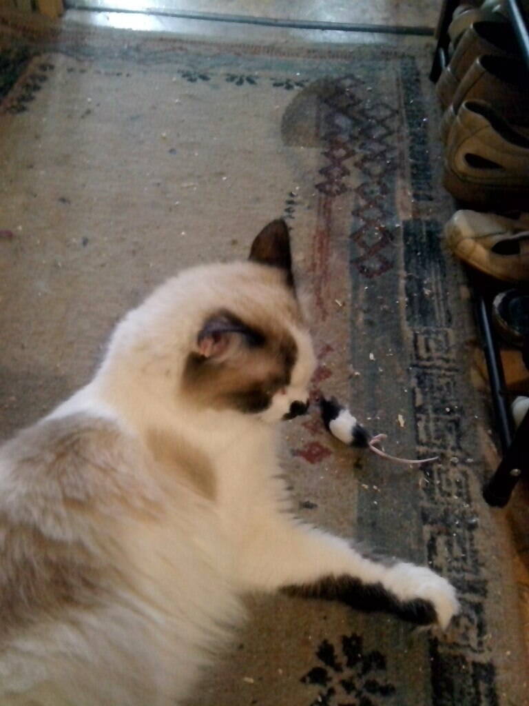 Когда Мэй исполнился год, на базаре была приобретена специальная кормовая мышь черно-белого цвета, под цвет кошки, и выпущена в пределах видимости охотницы.