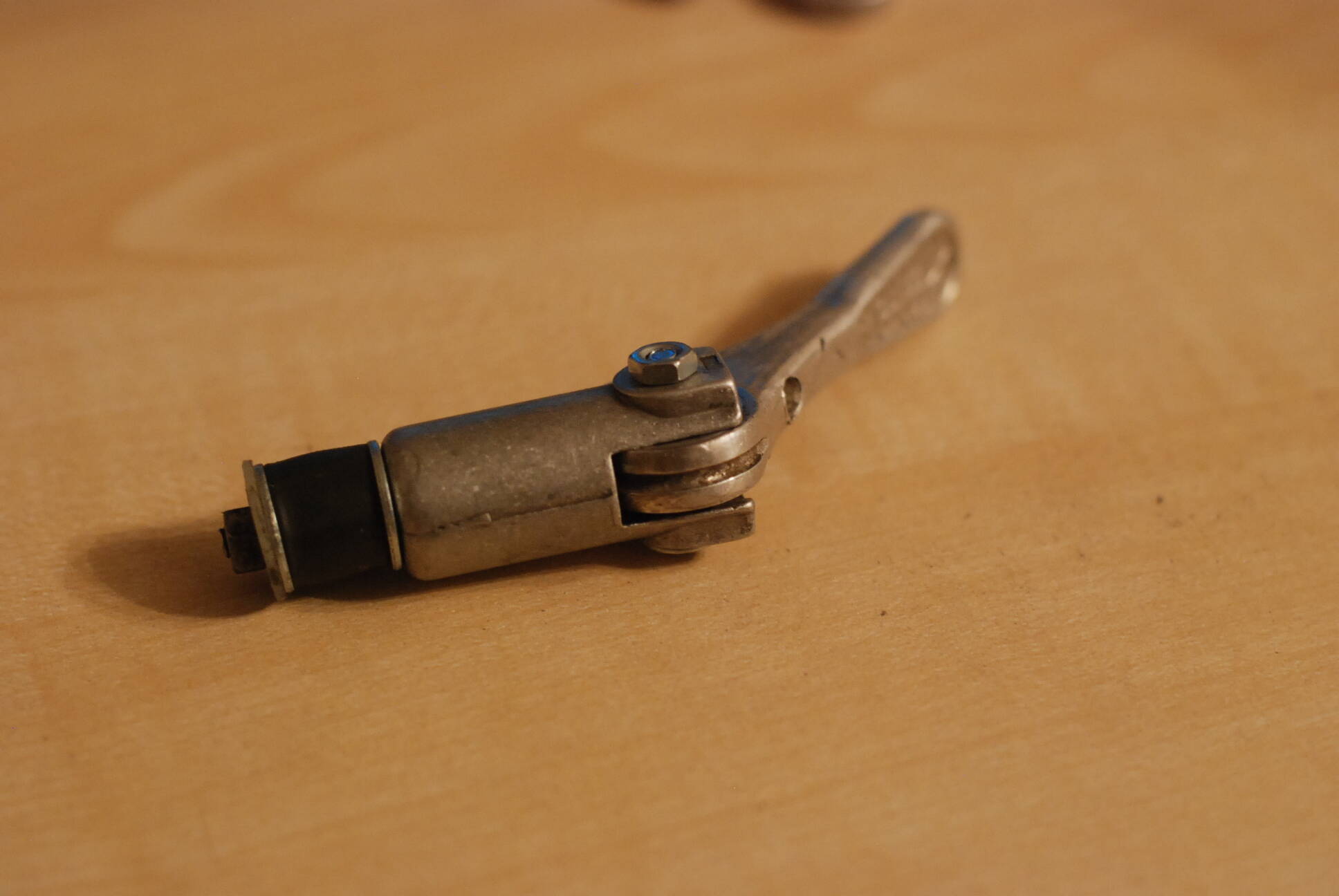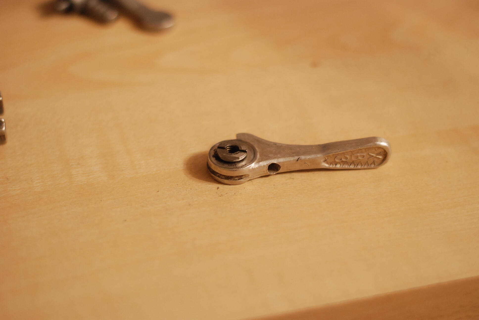Дальше фиксируем флажок и регулируем усилие его хода. Для этого хотел использовать болтики от бонок с двух сторон, но нужно было немного расточить отверстия во фланцах. Так как надфиля под рукой не оказалось, а собиралось это всё минут за 20 и исключительно в целях демонстрации метода, обошелся обычным первым попавшимся болтом соответствующей длины.