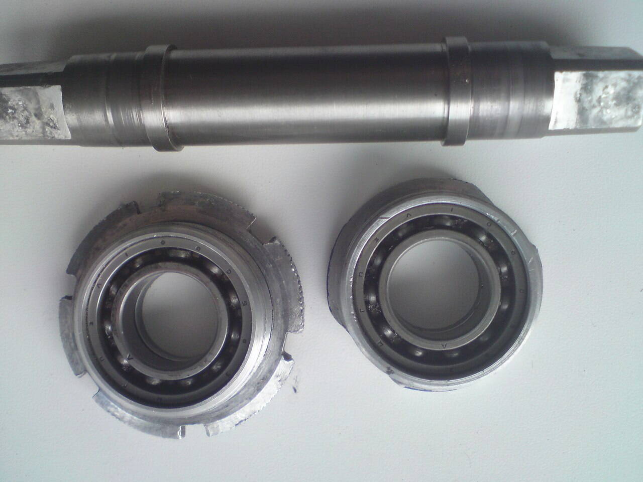 А вот каретка меня удивила и порадовала: пока велик был в сборе -- она даже не крутилась и выглядела так, что я уже думал что ей конец. Оказалось всё куда лучше: разобрал (без особых проблем, обе чашки правые, но по диаметру похожи на обычные ХВЗ), прополоскал в керосине, стала как новая. Чашки алюминиевые, под промы, вал полый, стальной, 113 мм. Крутится всё отлично, сидит плотно, блестит. :D