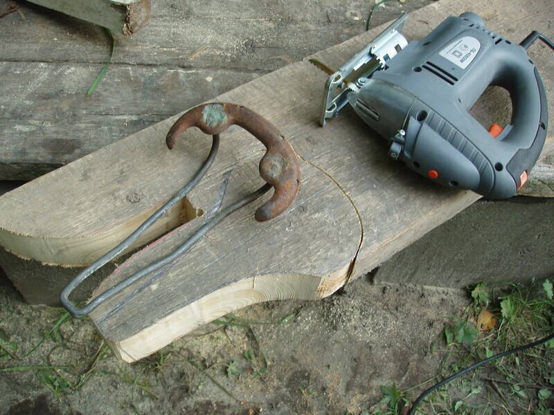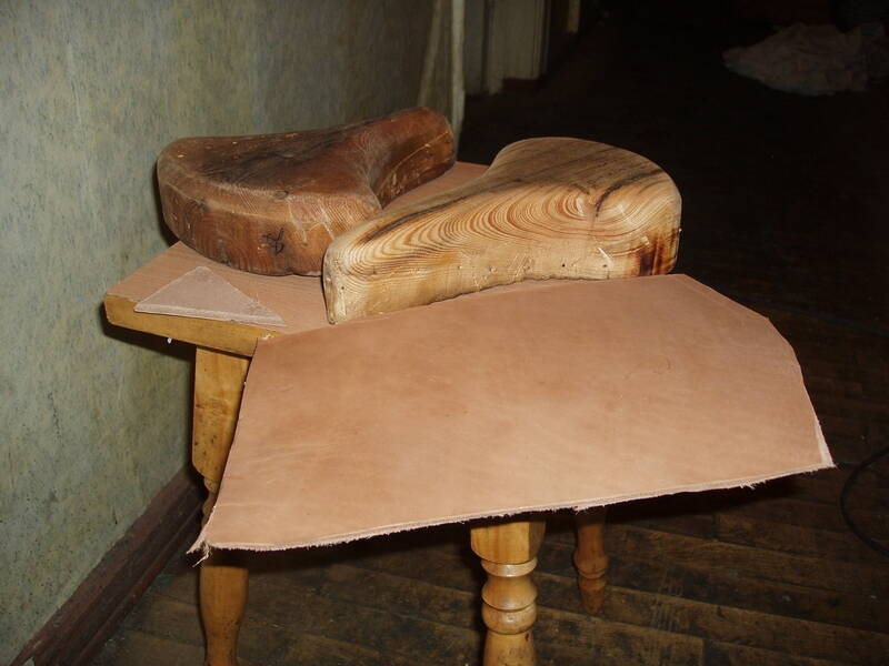 колодки. В местах крутых изгибов (по углам) кожа на боковой части между гвоздиками уходит в складку - её трамбовал молотком, одновременно подтягивая плоскогубцами. После этого кожа держит новую форму секунду - нужно успеть вогнать гвоздь. Вообще, тянуть лучше клещами, упираясь аж в тыльную сторону доски-колодки. Для этого нужно не жлобиться на кожу, вырезая кусок с достаточным запасом. И колодку укрепить, по-видимому.Как я уже говорил, заготовка должна иметь минимальный размер 30х30 см что для пружинной сидухи, что для спортивной. Вот седло в процессе затяжки: