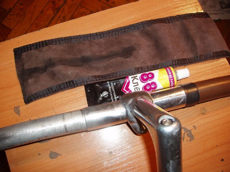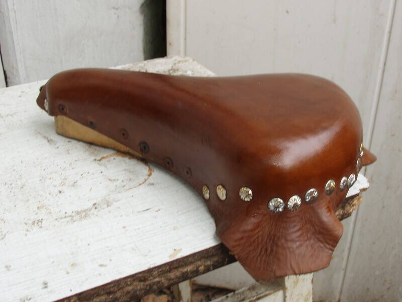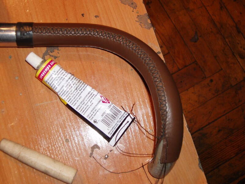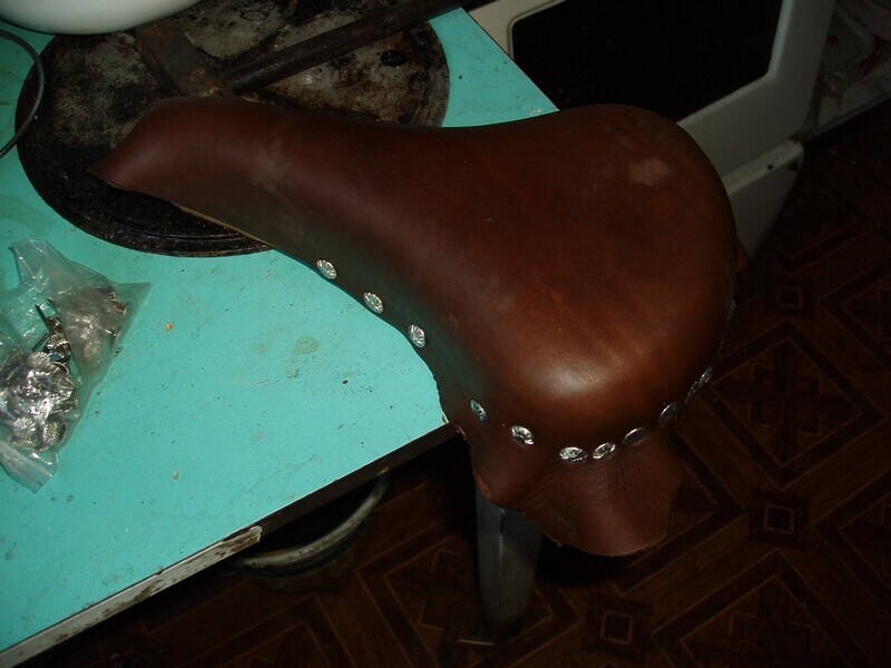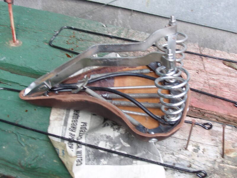 Немного короткие колодки размечал на глаз, прикладывая то детали каркаса, то старые шкуры). Из-за этого пружинное седло приклёпано тупо заклёпкой к носику (хотя похоже, так оно и лучше, чем по-штатному), а спортивное еле натянул на место - пришлось даже специальную приспособу сварить. И небольшие продольные складочки на нём от этого появились. Они типа винтажности добавляют, однако - непорядок... Длина колодки по-видимому должна быть 26 см для пружинного седла и 28 см для спортивного.