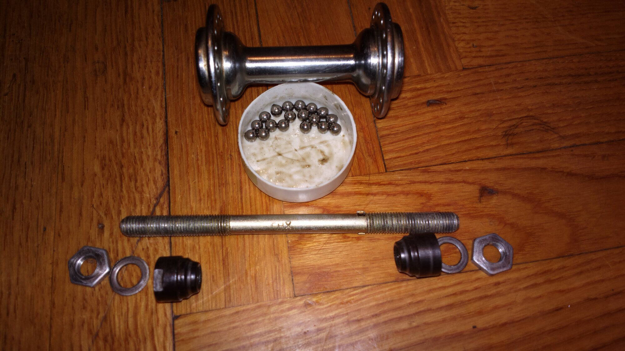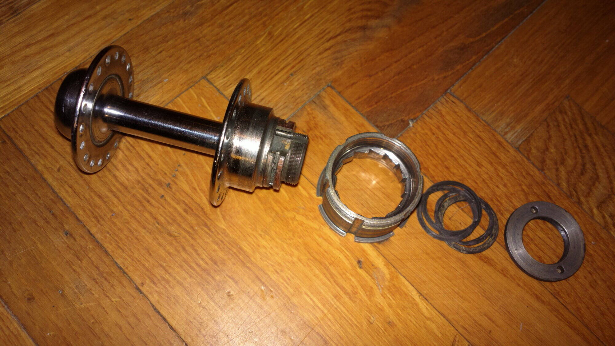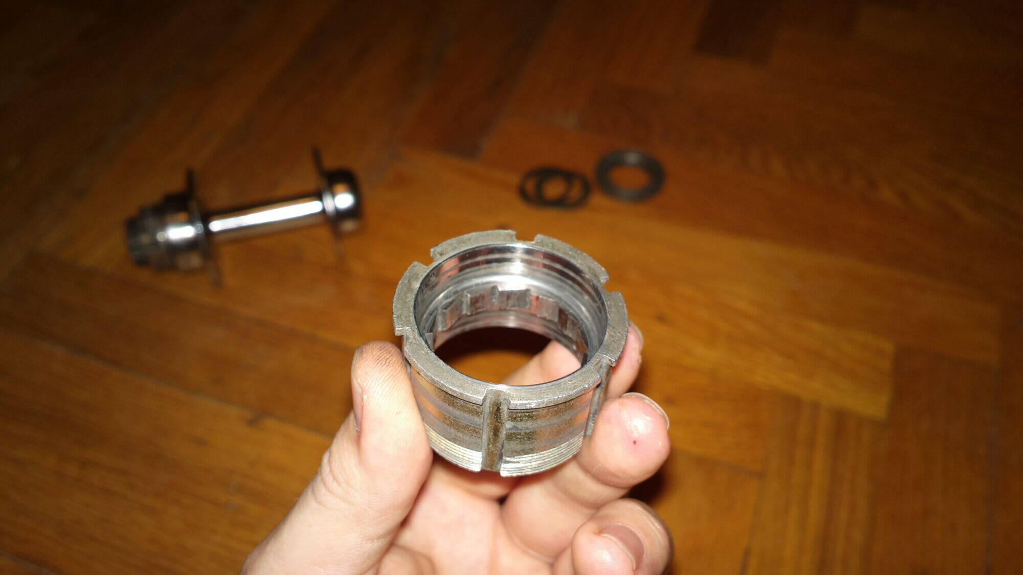 Комментарий к файлу: Передняя втулка. Ничего необычного, кроме того что с правой стороны (на фото) у конуса нету насечек под ключ, соответственно, он накручивается до ушек и законтривается об них гайкой.