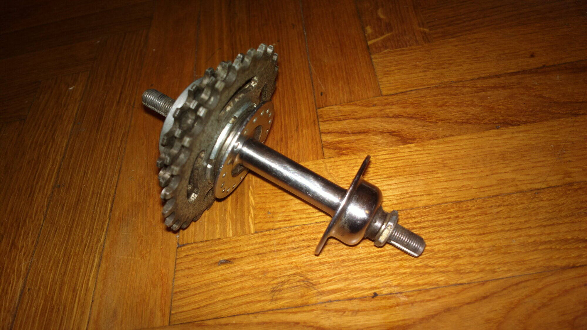 Комментарий к файлу: Итак, берем пассатижи или кусачки с узкими кончиками, раздвигаем их и насаживаем в прорези верхней шайбы задней втулки, крутим ПРОТИВ часовой стрелки (стандартная резьба), идти будет очень туго, готовьтесь попотеть, я делал это сидя по турецки, положив колесо на ноги. Пассатижи брал двумя руками и крутил как коловоротом. Чтобы трещотка не крутилась, снизу проткнул трещотку насквозь отверткой (протыкать не пришлось, она впритирку прошла сквозь самый маленький крест спиц у фланца втулки и через прорези в звездах.