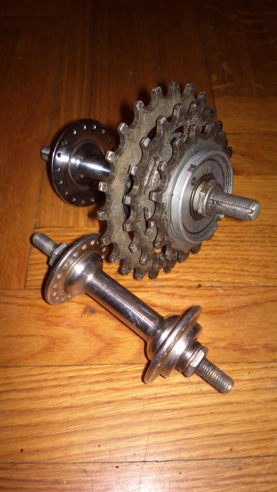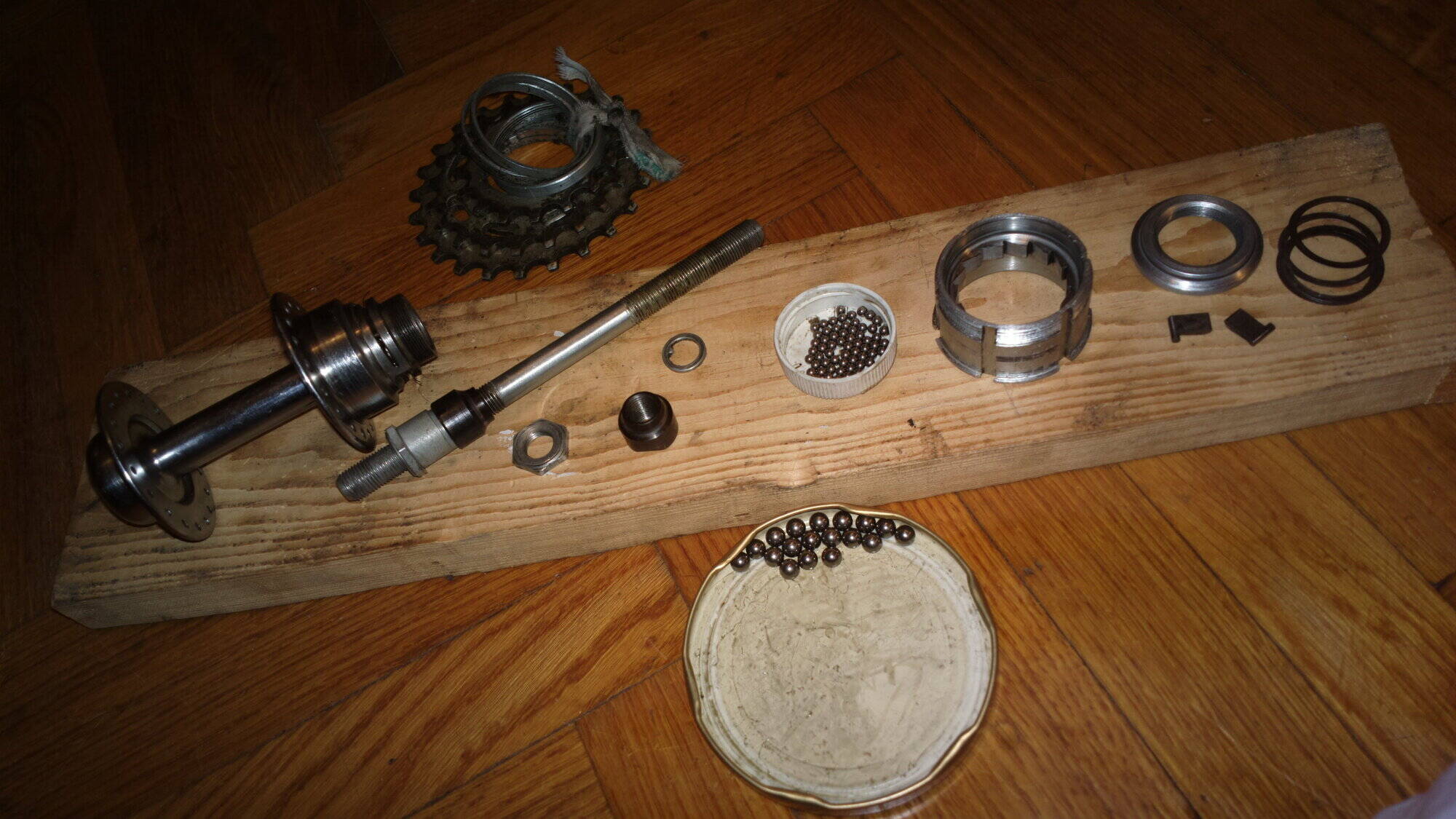 Комментарий к файлу: Вид в сборе. Сверху пара В-542, снизу - В-33. Отличаются по ширине. Также на втулках 61 года нету маркировки. Что запомнилось - никак не мог одеть трещотку на барабан от В-33, потом вспомнил фокус с ниточкой - одеваются собачки, потом на барабан надевается петелька из нитки, затягивается, концы нитки выводятся наверх втулки и обматываются вокруг верхнего кончика оси. Одеваем трещотку, разматываем нитку, оттягиваем узелок, режем ножницами, аккуратно вытягиваем нить. Если учесть, что это уже сборка и все в смазке, то цирк еще тот. Что еще запомнилось - шарики очень любят теряться - стелите тряпочки, чистите в крышечках, доставайте плоской отверткой или кончиком спицы, обмакивайте их в смазку чтобы шарики лучше липли и не падали и смело закладывайте. Магнитящие отвертки наверное не сгодятся, замучаетесь. Смазка итак липнет хорошо. А, по количеству. В-33: перед 9х9 шариков; зад 9х9+32х32. В-542: перед 10х10 (кажется все-таки стоит попробовать 9х9, а то крутится с легким заеданием), зад 9х9+31х32 (одного шарика не было, но это не критично). Если что еще будет интересно или вспомню - добавлю.