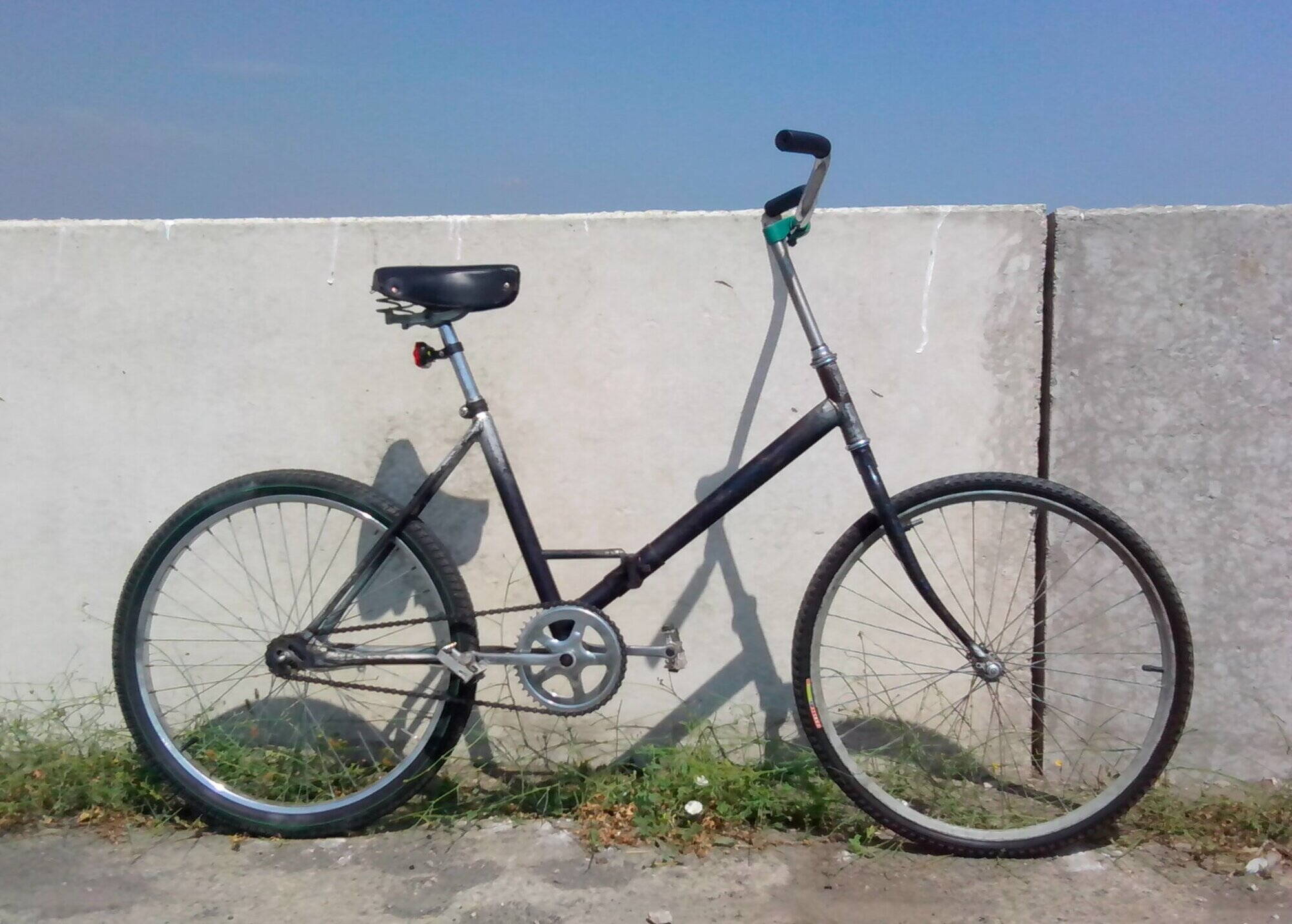 Передняя хромолевая вилка под 26-е колесо, установлены колёса 24 дюйма (спереди обод чайка), едет нормально.