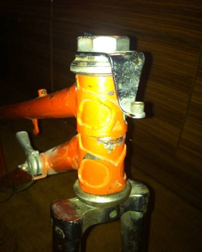 Досталась мне рама с "женской" скошенной трубой. Судя по маркировке на дропауте 60 года выпуска. Рама перекрашена поэтому никаких других опознавательных наклеек нет. Вилка хромированная. Размер рамы по срез подседельной трубы 50 см.