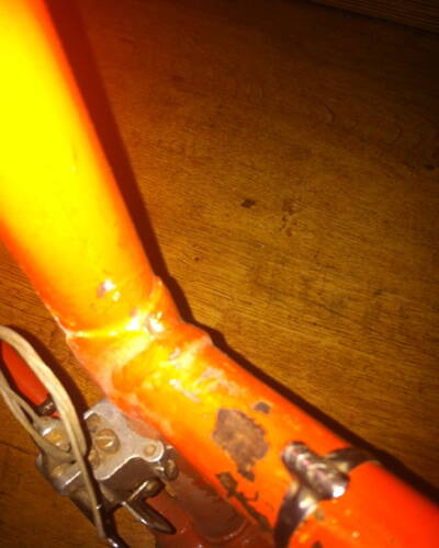 Порассмотрел раму внимательнее и склонен согласится с мнением о поздней переделке Чемпиона -ов (во всяком случае трубы не производят впечатление водопроводных) в такой вот эксклюзив. Кто-то для себя делал - швы на измененных узлах даже как следует не заглажены (см фото) Но рама при этом выглядит ровной.