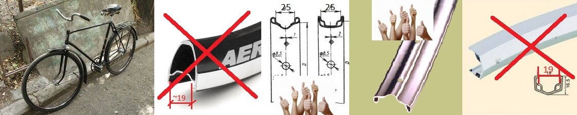 Широкий, 19 мм и при этом высокий двойной обод неприменим на хороших велосипедах вообще. Его жёсткость излишня для мягких велосипедов, а ширина велика для установки узкой шины, уместной на жёсткой скоростной раме http://krokovod.org/forum/viewtopic.php ... 615#p14615