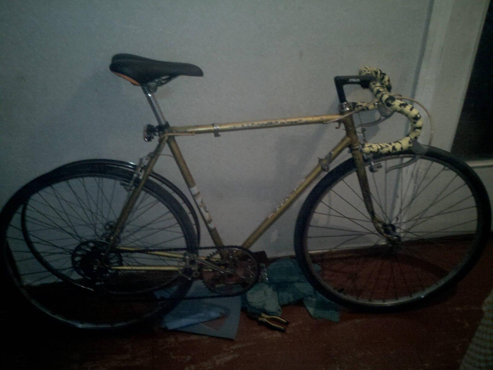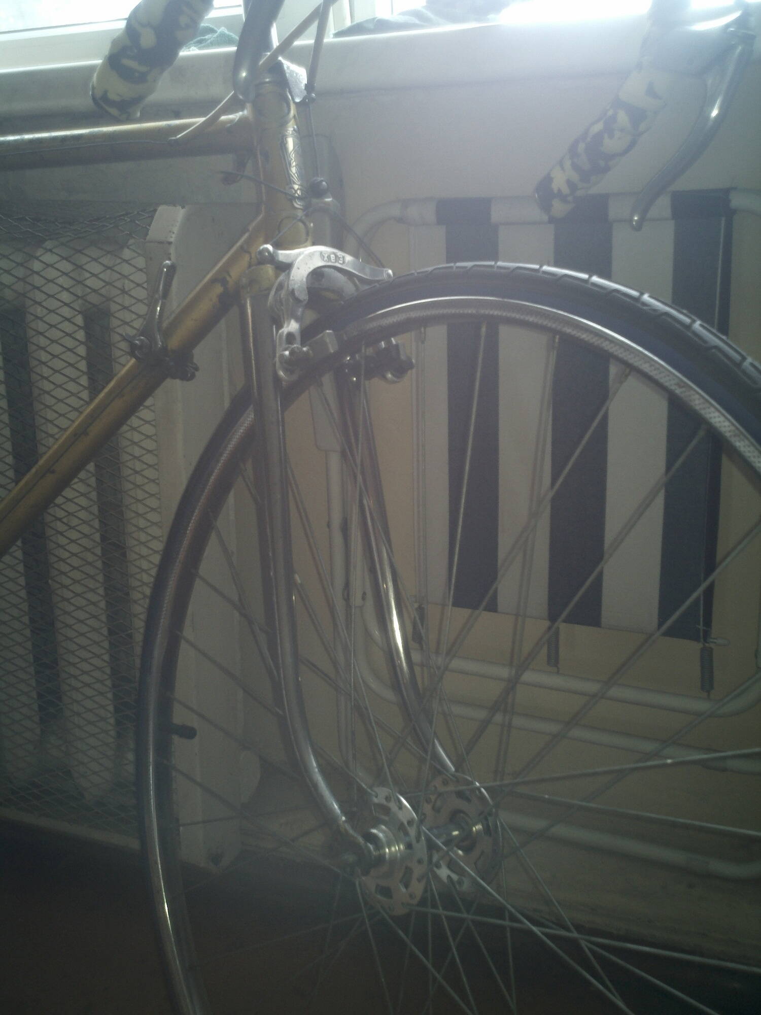 Доброго вам вечера.Заказал я себе из далёкого города Донецка,как то,велосипед.Ни когда раньше я не владел ни одним велосипедом,но однажды увидев в городе шоссейник(теперь я уже знаю,что это был спецзаказ)просто запал:)И пошарив в интернете,больше узнать подробнее о ХВЗ возможности в Одессе нет.У нас по-чему то ими почти ни кто не увлекается.Нашёл только одного мужичка,который оказывается был мастером спорта по велоспорту в СССР,он более не менее в них разбирается и не плохо собирает и чинит колёса от велосипедов.Он,в принципе,пока и консультирует меня по всяким вылезающим мелочам.В общем на этом же форуме взял и заказал оный аппарат из выше упомянутого города.Теперь веселюсь!!!Фото прилагаю под всей этой писаниной.Сказать честно,по прибытии и в процессе последующей сборки,я понял,что ровно ни-чего в них ни шарю:(Вопросы есть,а узнать(спросить,проконсультироваться)не у кого.Так что сам по-тихоньку,по-легоньку начал его перебирать.Первое что конечно мне доставило огорчение-это седло.Оно было ужасно!?Но так как ездить хотелось,первые пару недель,по вечерам катался на нём.Второе-коротковат оказался мне.Я с ростом 196,на 56 ростовке,не очень удобно располагался.Путём разных изысканий определился какой длинны можно найти вынос(и тем самым закинуть руки по дальше)и взял вынос Uno 100мм.Что принесло желаемое облегчение.Заказал новое седло Velo,но как мне теперь кажется,на родном как то удобнее:(Переднее колесо уже тоже пришло.На выходные обзаведусь покрышкой и камерой.А заднее пока побудет родное.Пока не узнаю о системах и их установке.Не полезу туда.Хотя меня и старая устраивает.Передачи я не переключаю,мне в принципе и одной хватает.Так что не вижу смысла менять систему.Состояние покраски конечно аховое,но я решил его забомбить.Ещё не видел здесь на форуме такого,да и всегда хотелось попробовать как оно будет смотреться на шоссейной раме.Пока дошёл до переднего тормоза,почухал наждачкой,позже покрою лаком.Когда забомблю,обязательно выставлю на ваш суд.