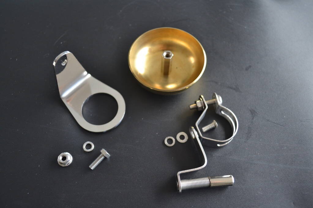 Захотелось заиметь на велосипеде звонок. Как оказалось, даже размеренная прогулочная езда на дорожном велосипеде иногда требует его присутствия. Долго думал, и пришёл к следующему. Электрический - точно не хочу. Гудок - тоже. Остаётся механический с железной чашкой. Но, опять же, тянет к оригинальности и есть латунная чашка от старого дискового телефона. И хочется звонок не на руле, а на раме или на рулевой колонке. Порылся в интернете и нашёл подходящий вариант: