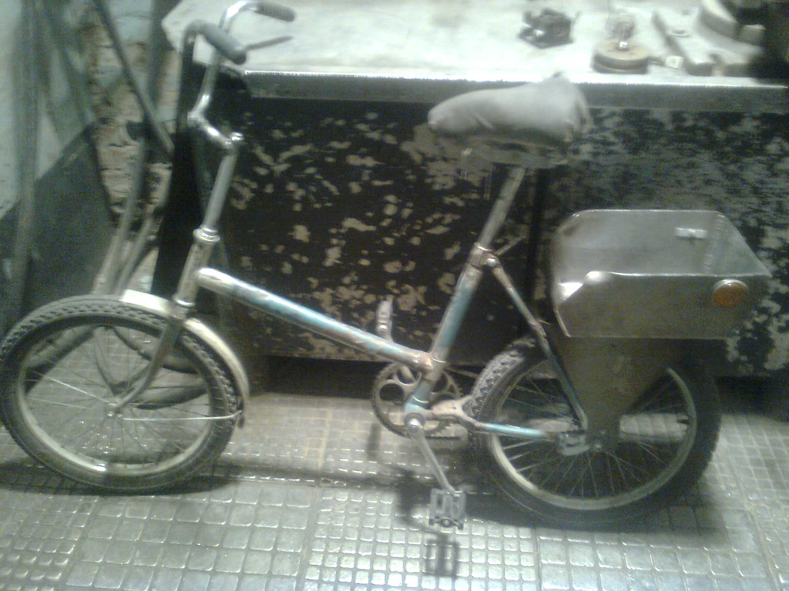 Есть еще третья поздняя Кама (90-е годы), так вот она превратилась в советский Фэтбайк, мопедовские покрышки, усилена рама, прицеп часто таскает. Но качество рам из 90-х никакое, на фото видно, что вся переварена. Но и нагрузки на неё бешеные, прицеп на мопедовских колесах с грузом 50- 100 кг (двигатель например), сам электрик под 100 кг, и сумка с инструментами на багажнике на кг 10-20.