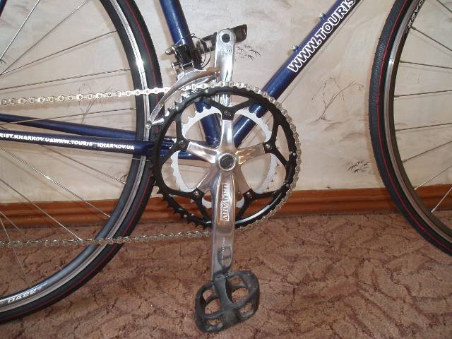 кассета байковская, тормоза туристические - в них залазит достаточно широкая резина и большой грязевой просвет. Резины у меня уже 3 комплекта :) Это стоит дешевая шоссейная. 20 гривен покрышка. Офигенная резина. Я на ней даже тандем Cinelli видел :)