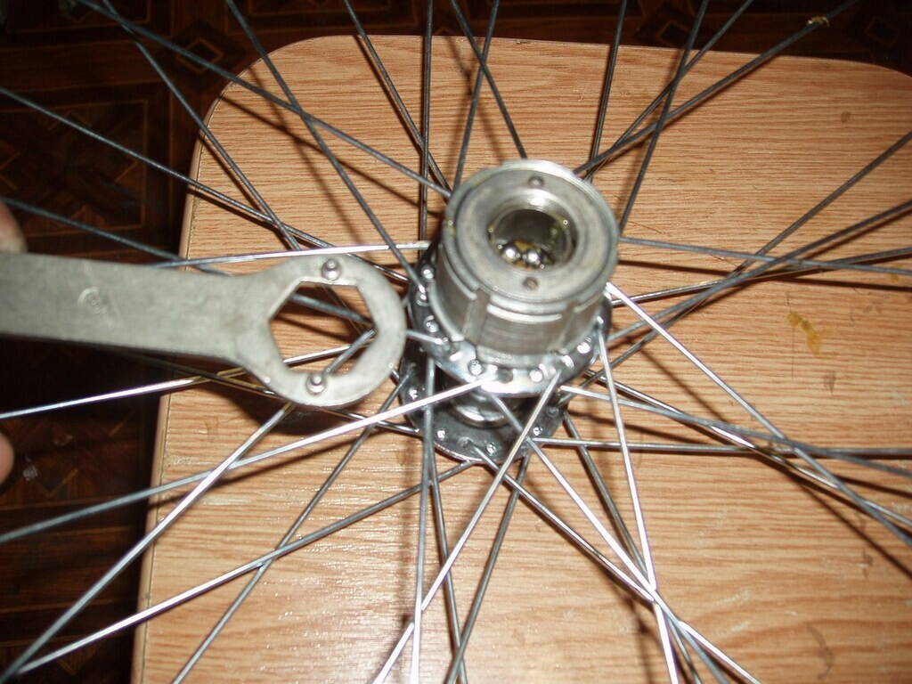 Спецключ (хоть самопальный). Но там сталь по алюминию - могла и прикипеть за годы. Если что - можно разобрать трещётку, не откручивая её основание с корпуса втулки. И трещётку в порядок привести, и спицы проходят при снятой.