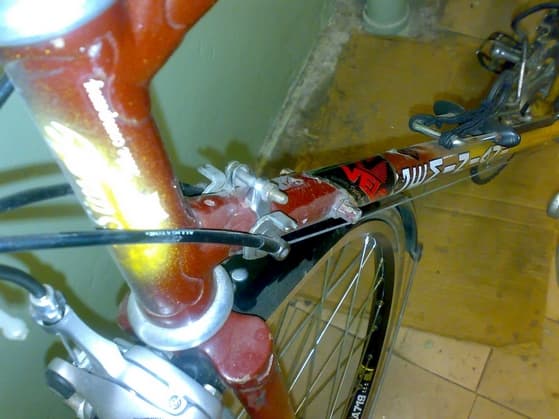 Что за рама, не знаю. Кто говорит Чемпион, кто Тахион. По размерности чуть больше общеупотребительной СтартШоссе, но совершенно другие углы и задний треугольник. Взял у закомого за 1500 руб+200 руб за изготовление ввертыша в петух (была убита резьба).