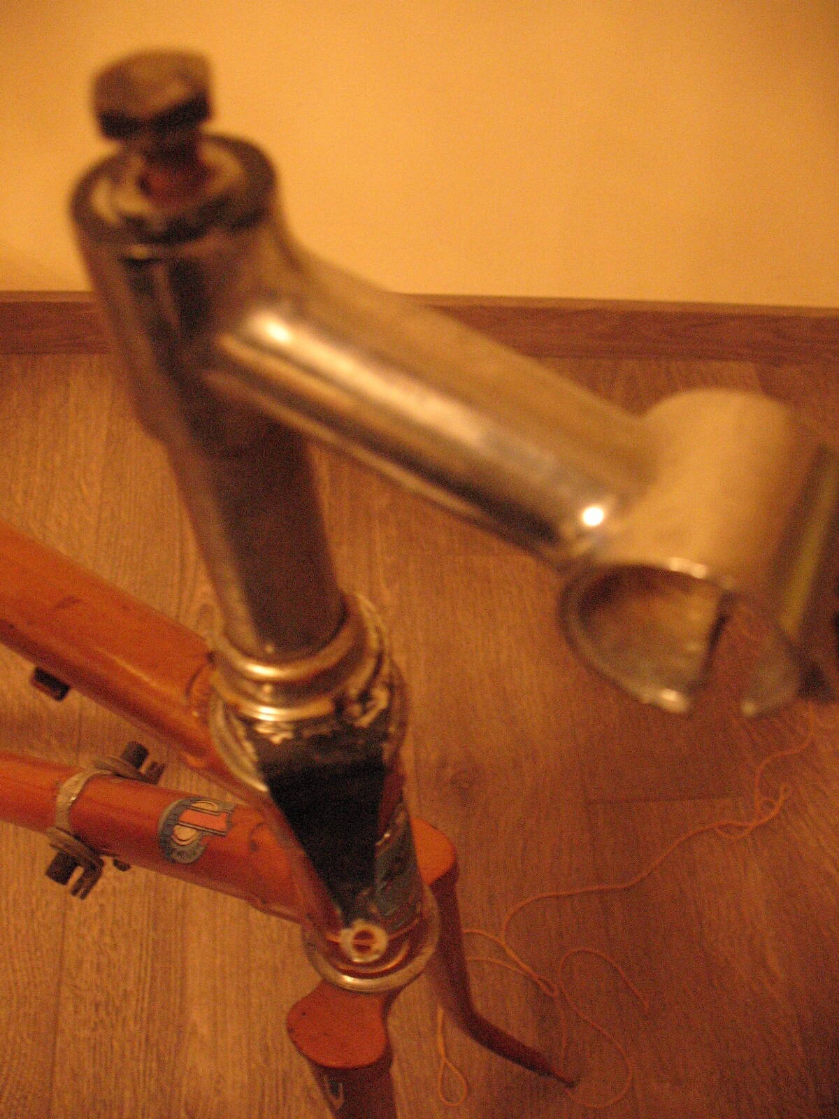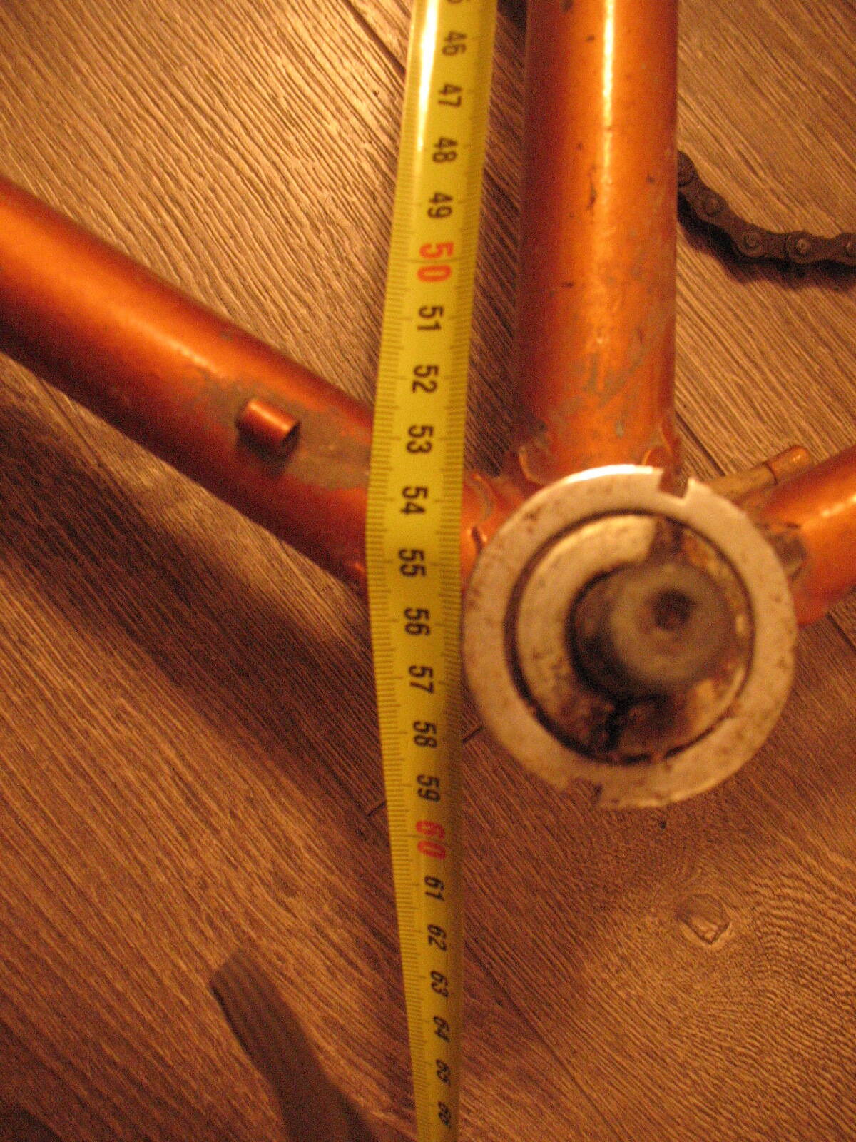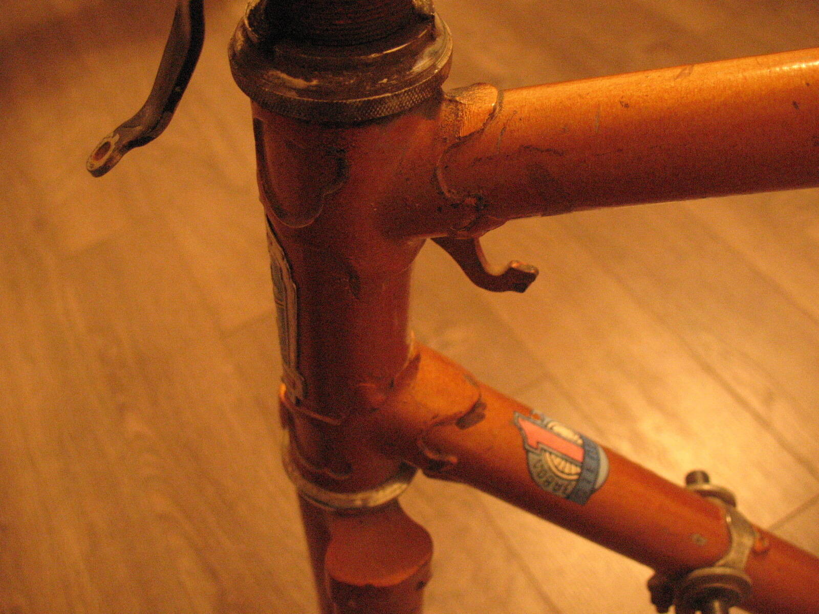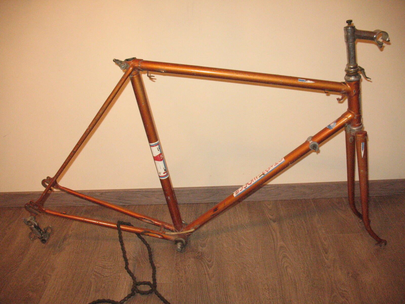 Не прошло и пары недель как я закончил высиживать своего первенца на базе В-542, руки опять зачесались и по этому поводу был приобретен фреймсет В-555 1975 года, высота рамы 56 см. В нагрузку достались рулевая, вынос, кожаное родное седло, подседельный штырь, цепь, половина заднего переключателя и каретка. ЛКП в большей мере сохранилось, изначально даже зрела идея не перекрашивать, но посмотрев поближе на раму начал сомневаться. Дело не в ржавчине или сколах, а в качестве спайки труб. Как писал здесь один из коллег - металла тогда явно не жалели, что собственно и видно по выплескам. Местами качество спайки не очень, мой первый В-542 спаян поаккуратнее. Думаю, что придется все тщательно зачищать напильником. В общем и целом состояние на 4 балла. Рулевая раскутилась руками, в чашках были насыпаны шарики, но смазка превратилась во что-то ужасное. Каретка раскрутилась на половину - левая чашка с контрагайкой сошли легко, правая пока не поддается. В левой чашке 11 шариков, в правой 10. Предыдущий хозяин пытался колхозить и зачем-то покрасил торец выноса и фигню в которую упирается боуден переднего тормоза в черный цвет. Имея уже опыт установки современного оборудования на крокораму, в этот раз, наверное, буду собирать родные комплектующие. Баран, пистолеты, втулки и трещотка пятерик уже заказаны. Если кто подскажет где добыть шатуны, буду благодарен, насколько я понял найти систему - целое дело. Обода постараюсь тоже найти родные. Кстати, какой размер покрышек устанавливался на этот велик? По ТТХ колеса ставились не 28, а 27,5 дюйма.