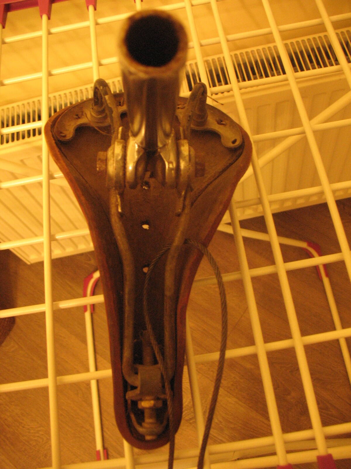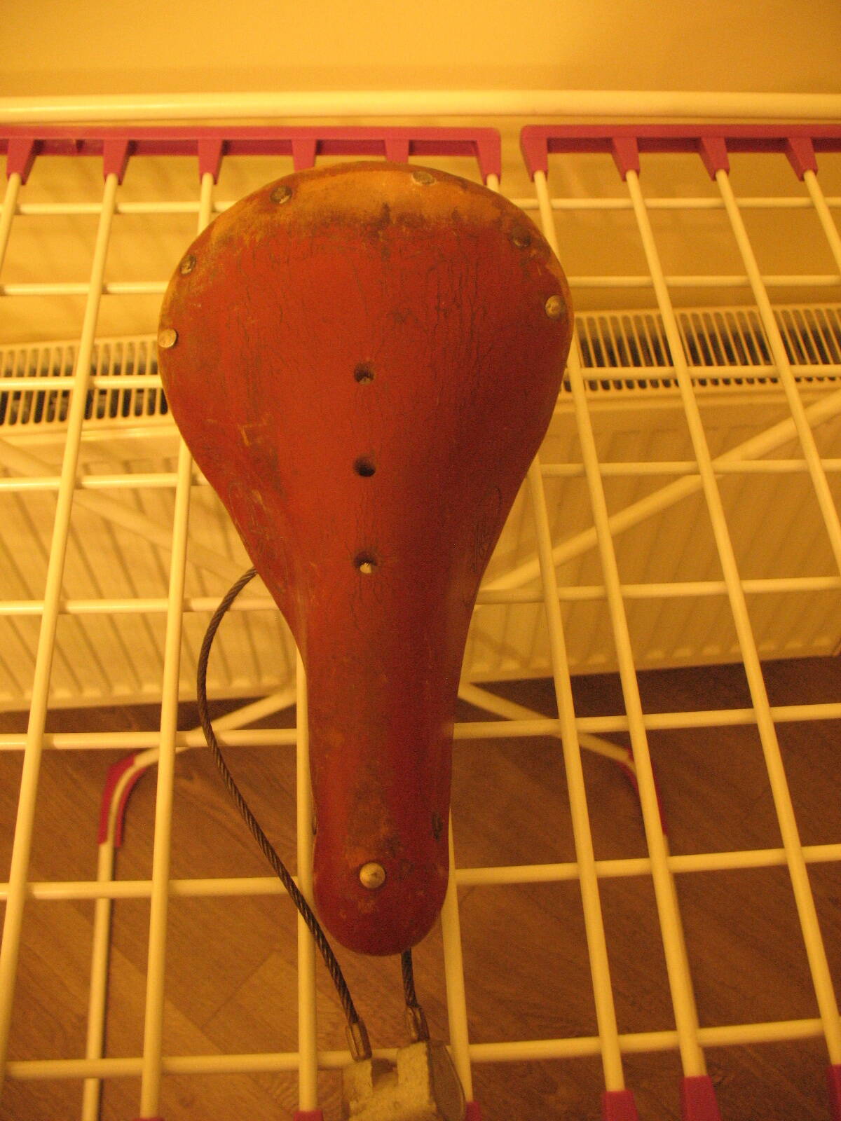 Седло вообще зачетное - слегка потерто в задней части, но по всей поверхности родная краска. Кожа твердая как фанера, есть небольшие пятнышки коррозии в металлическом носике и следы черной краски на рамке :shock: подседел и замок как новые. С седлом работы меньше всего будет :D А вот над рамой придется потрудиться. Сегодня утром при посмотрел при дневном свете - похоже что вскрывали лаком, есть потеки местами. Наверное таки перекрашу, но в родной цвет и позже. Пока буду собирать компектующие.