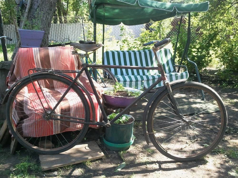 Жемчужина мой коллекции, "Прогресс" В-110 1953 года, достался от соседа. Особенность велика в системе под квадрат, передача 46 на 18. Вел был в плохом состоянии, так как простоял в сарае больше 5 лет, везде была ржавчина, поэтому в течении 4 дней перебрал втулку, рулевую, поставил каретку,покрасил раму, вилку и крылья, переспицывал колеса, поставил цепь, осталось восстановить седло.