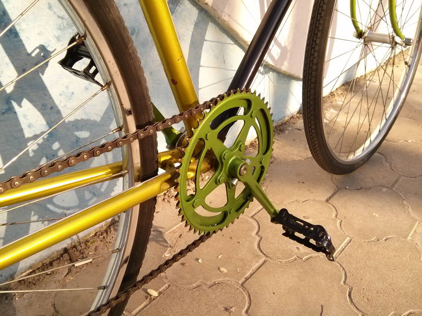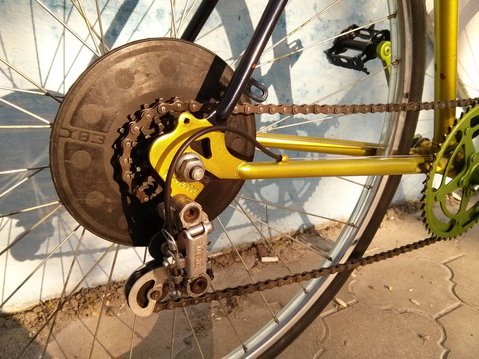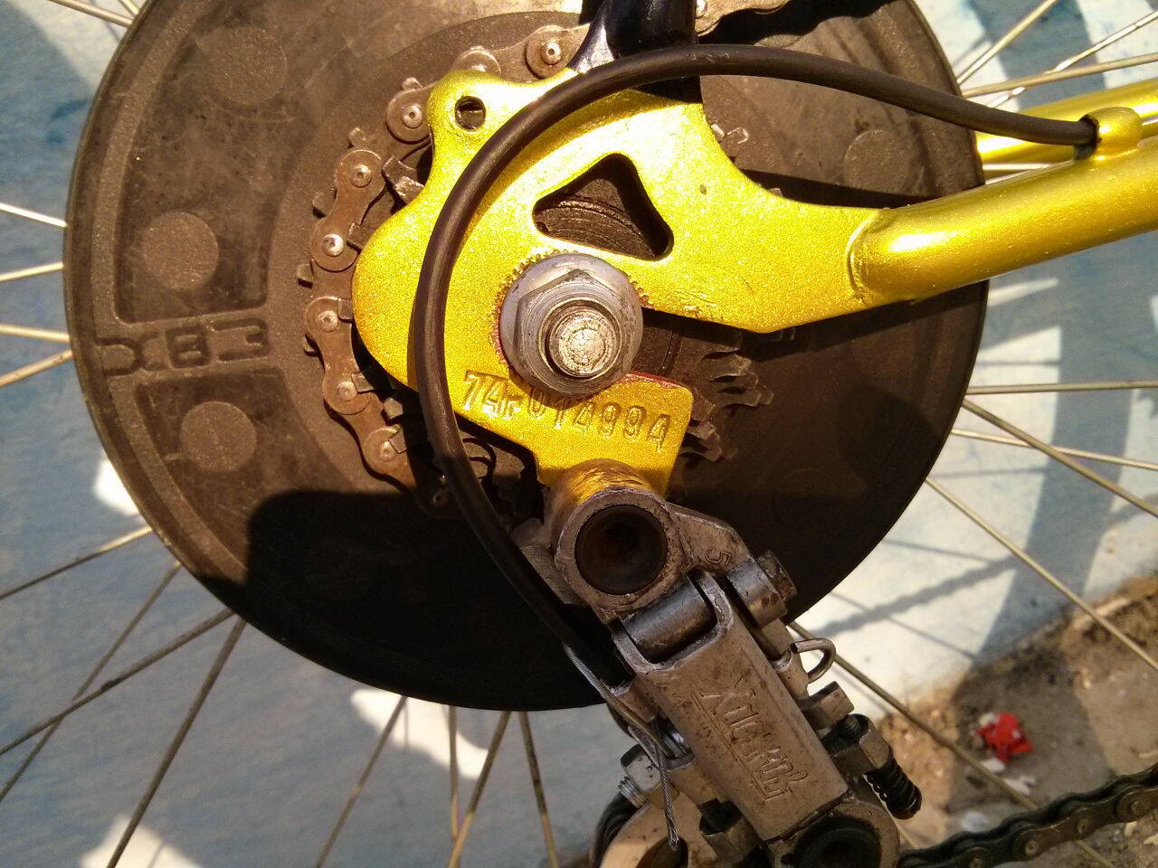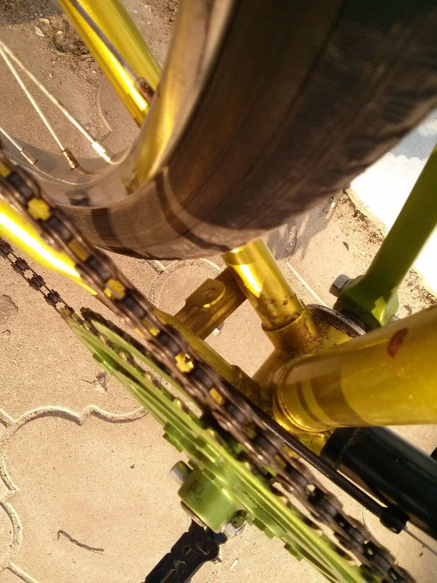 Передний переключатель временно снял, трет рамку цепью.