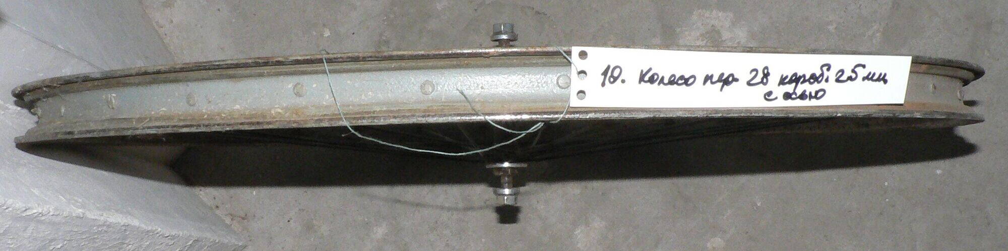 15. Колесо 28 коробчатый обод, ширина 25, железо с накаткой с боков, с осью, без повреждений, 50 грн.