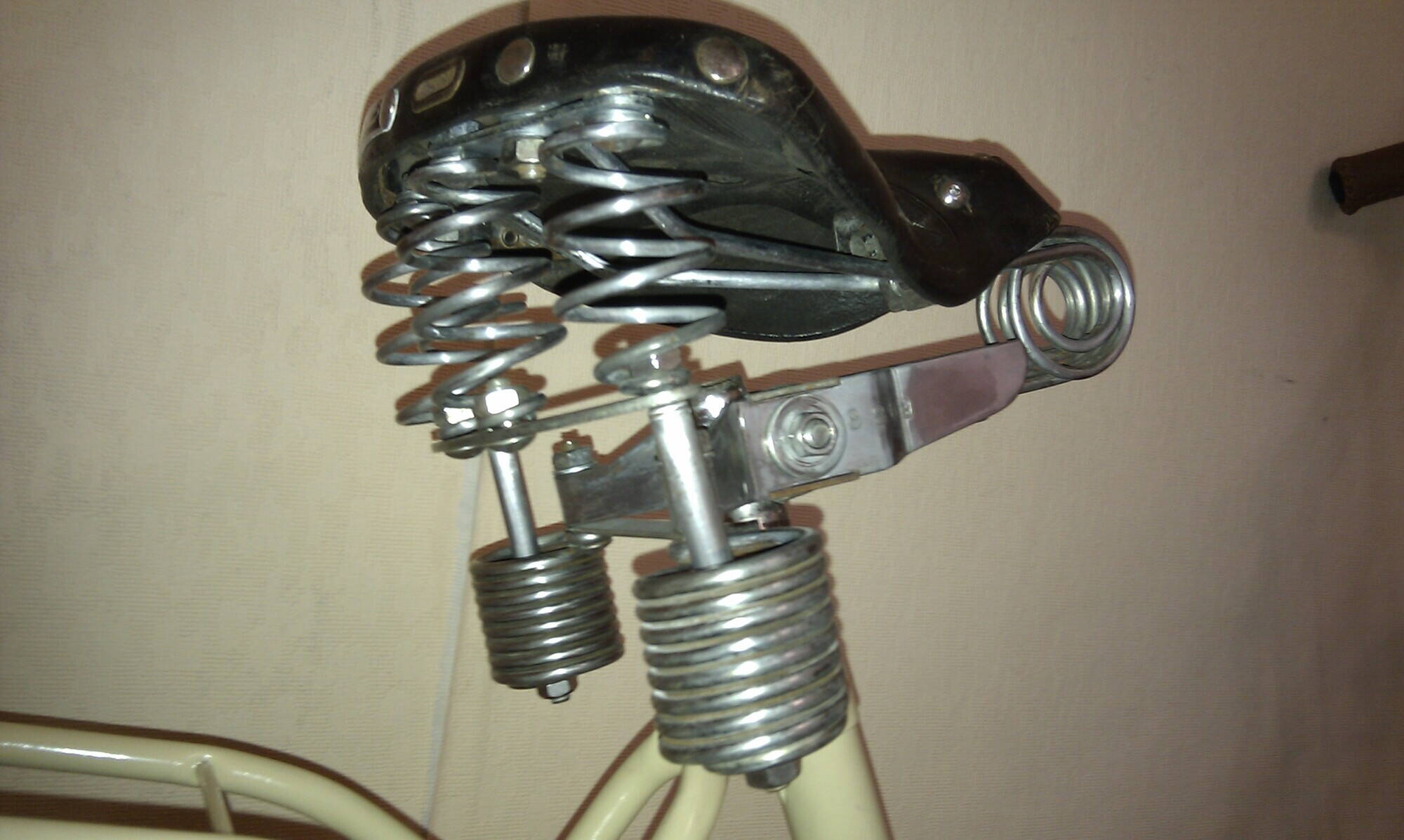 Руль хромированый, единый с выносом. Рулевая обычная дюймовая с дюймовой резьбой. Вилка была ломаная, одна нога шаталась у короны. Вынос снялся только после откисания в ВД-шке. Сама рулевая в хорошем состоянии. Подседел тоже обычный, крепление седла на замке. Седло кожаное с двухярусными пружинами, каркас был хорошо ржавый и на самом седле не хватало заклёпок.