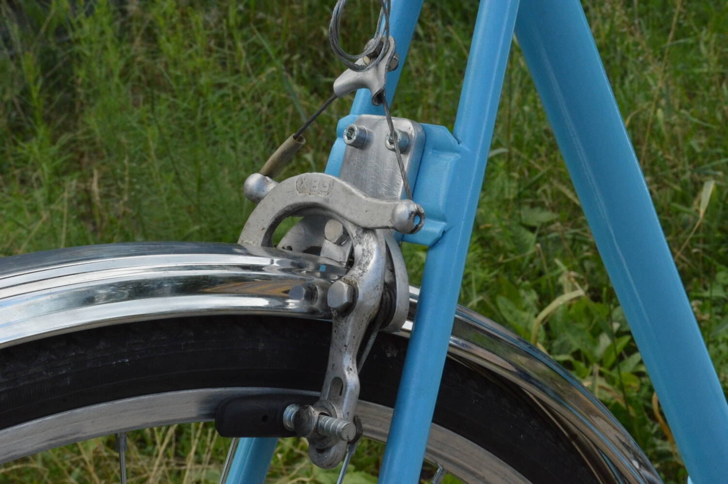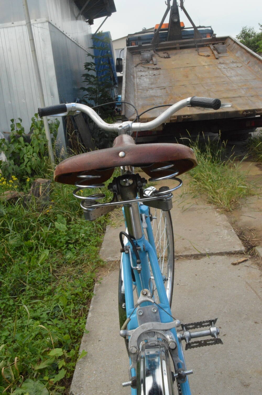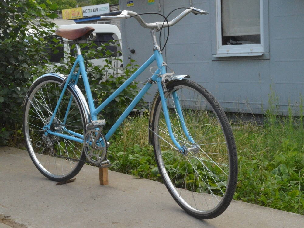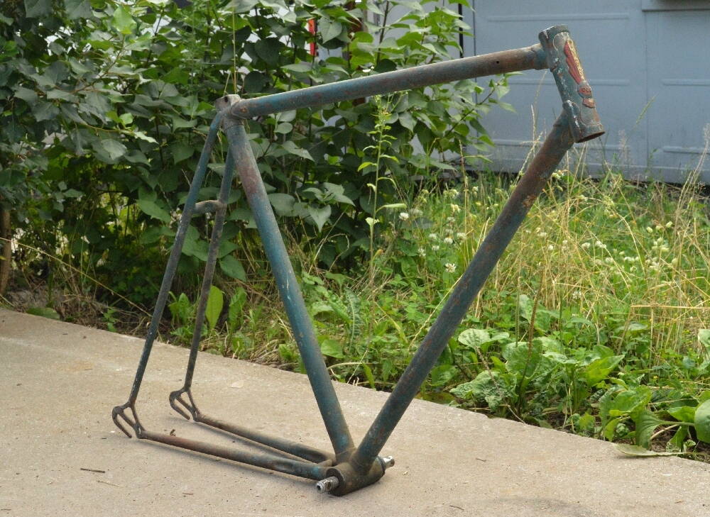 Теперь попробую о каждом отдельно. Появилось у меня все это добро, и жена говорит а где мой :sad: . На следующий день была куплена рама туриста женского. Похоже она была новая ( 94г.) но хранилась плохо (поржавела, задние перья придавлены в левую сторону) Но благодаря темам kisa все было решено достаточно быстро ( за что ему ОГРОМНОЕ спасибо ) :smile:. Потом поход на барохолку все что нужно нашлось ( благо почти все было в запаса до покупки рамы). Потом окраска. Краску соседи авто маляра смешали (дали наставления что и как ) и понеслось. По фото плохо видно но цвет с перламутром. Рама окрашена , все есть , и вот сборка !!! (Первый велосипед собирал, основной вид деятельности автомеханик). И знаю что сначала все собери до последнего болтика, потом разбери и только потом окрашивай. Но нет шило в ж... :facepalm: . В общем пролет с задним тормозом (колодки по высоте не достают до обода) Похоже планка приварена выше . Пришлось городить вот такое